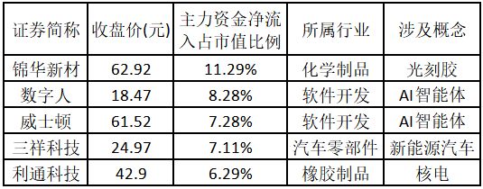 主力资金净流入金额占市值比例排名前 5 的个股分别是锦华新材、数字人、威士顿、三祥科技、利通科技。