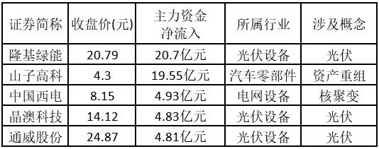 从行业来看,今日有较多光伏板块个股涨停。主力资金净流入金额排名前 5 的涨停股中,有 3 只属于光伏概念,包括隆基绿能、通威股份这两家市值千亿元的巨头。