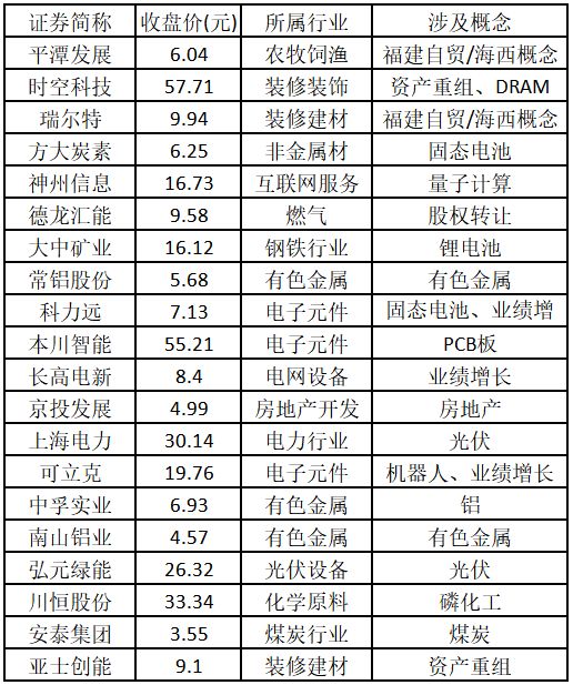 涨停板个股中,股价创出近一年新高的个股有 20 只 (不包括创出历史新高的个股),包括平潭发展、时空科技、瑞尔特、方大炭素、神州信息、德龙汇能、大中矿业、常铝股份、科力远、本川智能、长高电新、京投发展、上海电力、可立克、中孚实业、南山铝业、弘元绿能、川恒股份、安泰集团、亚士创能,具体如下表所示。