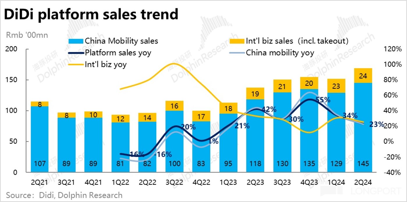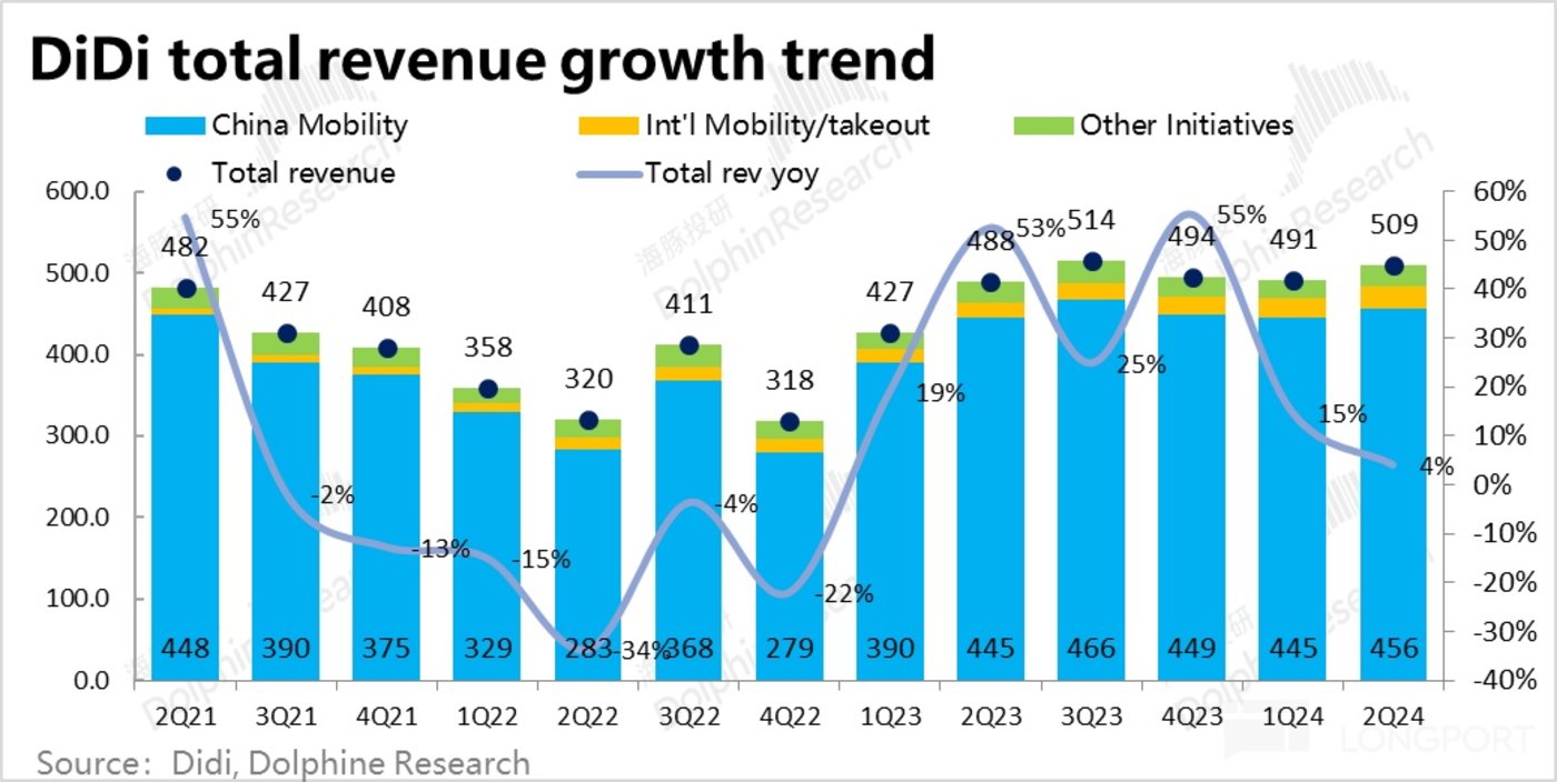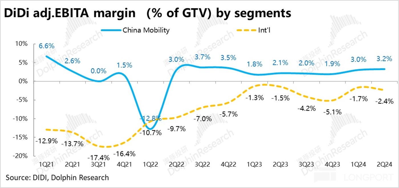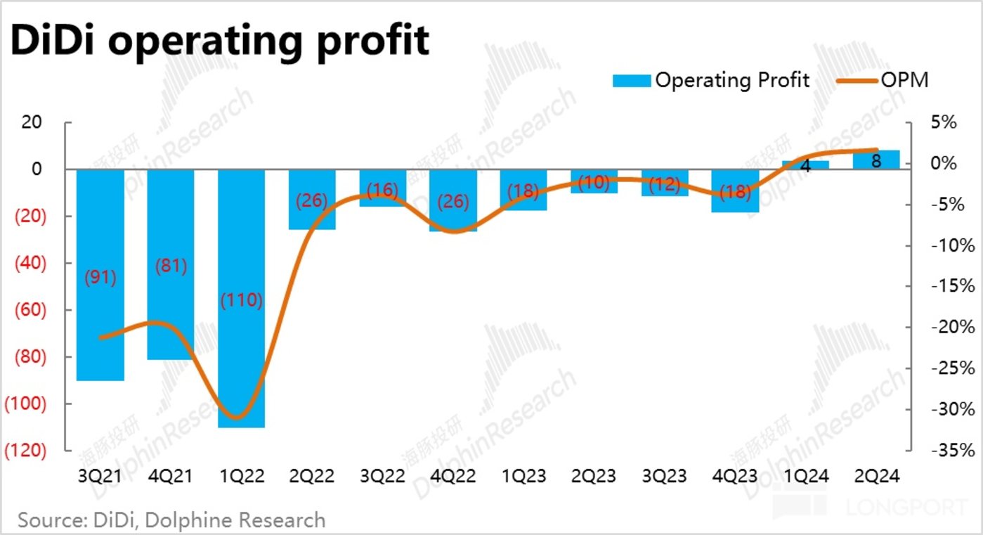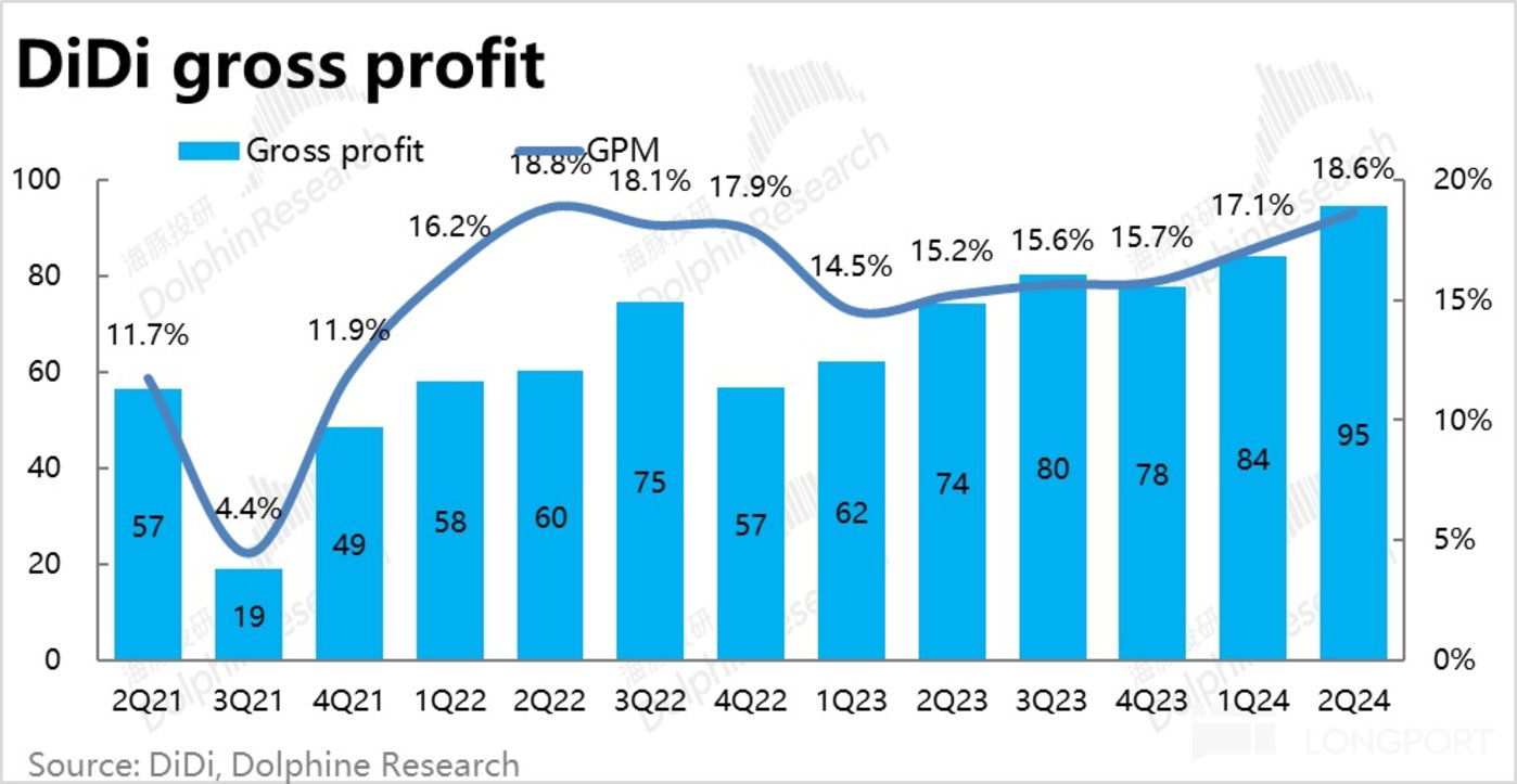 营收角度,滴滴国内出行板块本季收入 456 亿元,同比增长 2.6%,收入增幅明显低于 GTV 近 9% 的增长。海豚投研认为,大概率是因为弱需求下,滴滴给予消费者的补贴 ( 记作收入的减项) 更高了、占 GTV 比例走高,其次代驾、顺风车等按净收入确认的交易额比重的小幅提升也可能是原因之一。