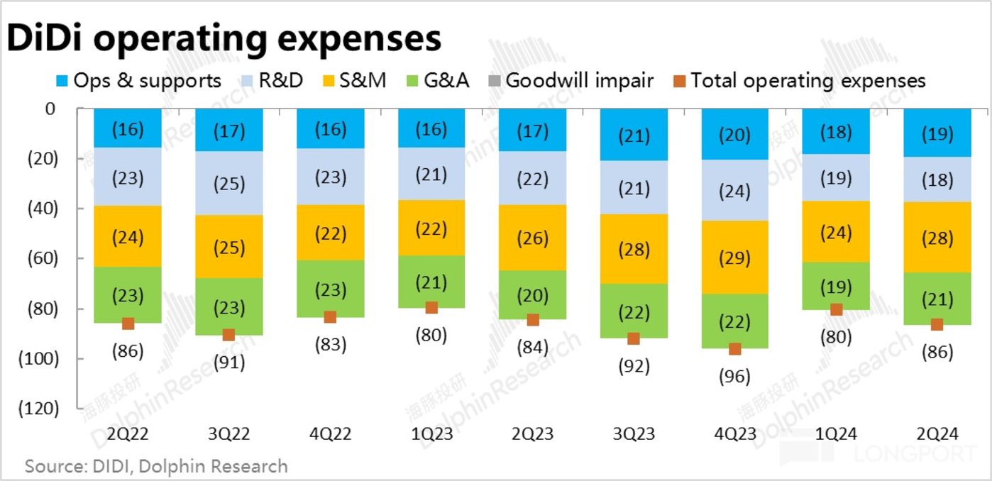 费用支出上,虽不再同比减少,但仍保持着谨慎加大投入的路径。本季四项经营费用总支出 86 亿,相比去年同期略增 2 亿。伴随着国内平台 UE 的改善,运营支持、营销和管理费用都同比小增 1~2 亿,研发费用则因出售自动驾驶业务的影响,是唯一同比下降的。