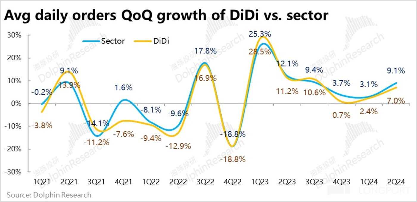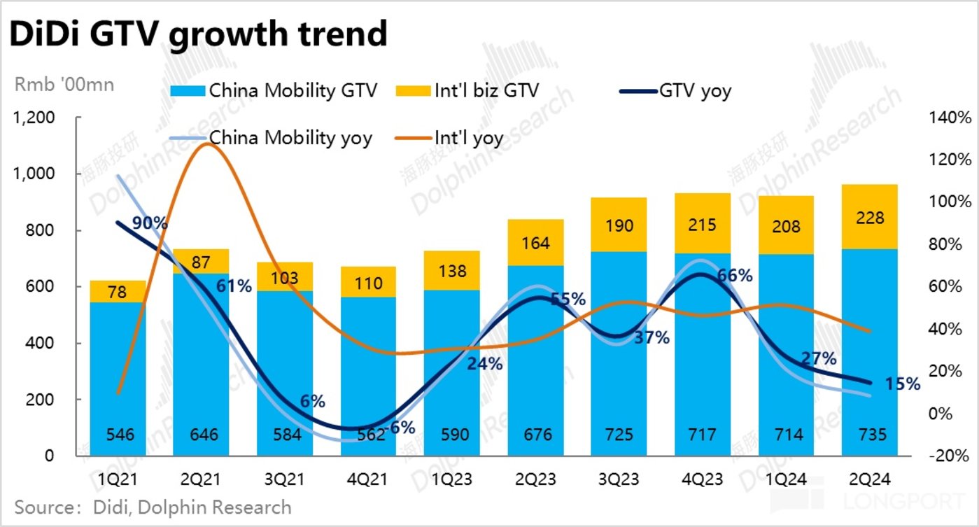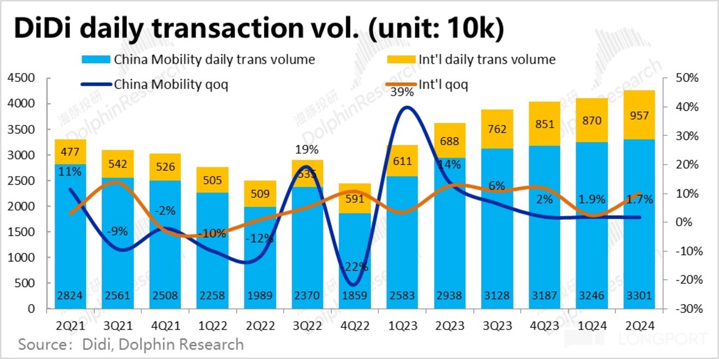 照例先看运营数据上,2024 年二季度滴滴国内出行实现 GTV 735 亿,由于去年同期放开后较高的基数,同比增速大幅放缓到了 8.7%。而我们主要关注的环比角度,本季国内 GTV 相比上季是增长了 4.4%。参考过往的季节性变动幅度,本季的增速也不算强劲,属于平稳表现。