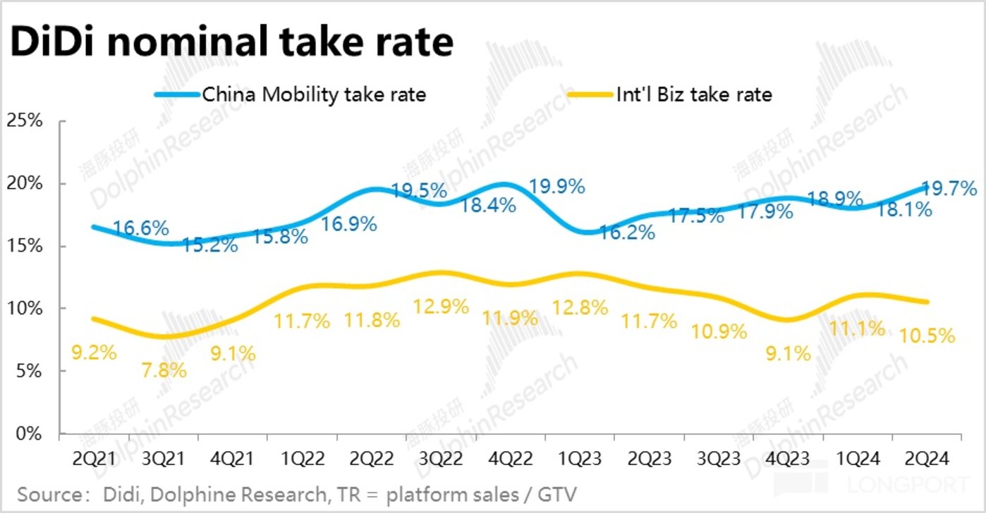 而滴滴国内的平台销售额(GTV – 司机分成/激励 - 税费等) 本季则是同比大增了 23%,大幅高于 GTV 和营收的增速。两者间增速的明显差异,当然同样有自营、聚合、代驾等不同业务收入结构变化的影响,但大体上仍可推断给司机分成的比例又走低了。