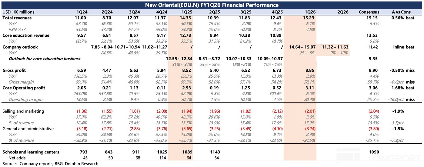 $新东方 (EDU.US) 北京时间 10 月 28 日美股盘前发布了 2026 财年第一季度的业绩,这个对应的是自然年下 2025 年 6 月至 2025 年 8 月的暑期旺季的经营情况。