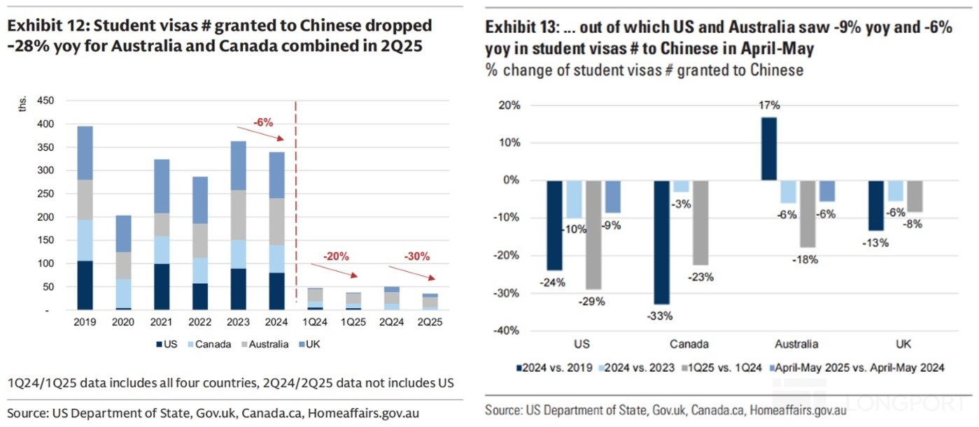 对留学业务,海豚君建议仍然谨慎为上。虽然地缘矛盾似有缓和,短期也可以通过留学需求转移到非美地区而对冲影响,但不确定 + 反复变化,仍然会在中期视角上持续消耗未来用户的需求。下图显示,今年以来签证发放量降幅明显。欧美均有不小降幅,澳洲则存在明显的替代效应。