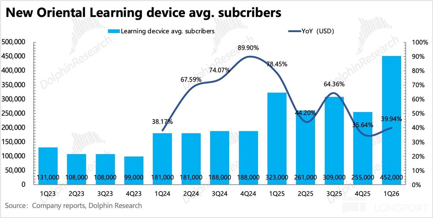 但从非学科课程报班人次 (yoy+10%) 和学习机订阅人数 (yoy+40%) 变化趋势来看 (增长加速),当期表现应该只是暂时,下季度增速有望回暖。具体细分情况和展望,可关注电话会。