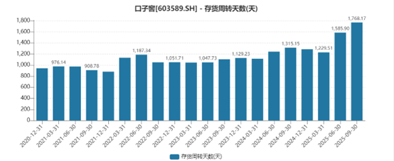 作为白酒企业的“ 蓄水池”,公司合同负债也来到近五年最低点 3.38 亿元,同比下滑 4.43%。经销商拿货的积极性并不高,前两个季度分别下滑 28.12%、5.95%。同时,公司存货周转天数来到 1768 天,再创新高。