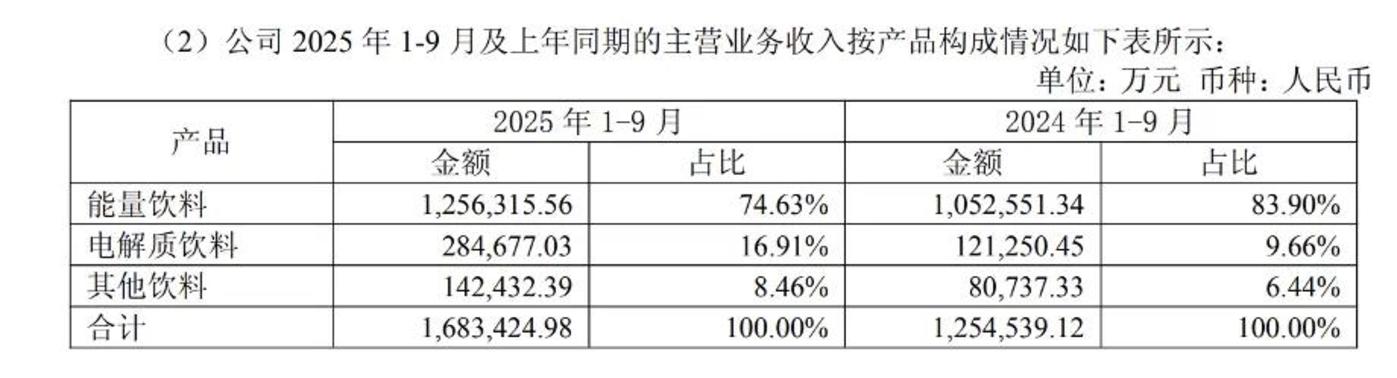 财报显示,「东鹏补水啦」 前三季度收入猛增 134.8%,达 28.47 亿元,占比升至 16.9%;「其他饮料」 的收入也从 8.07 亿元增长到 14.24 亿元,增幅达到 76.5%。