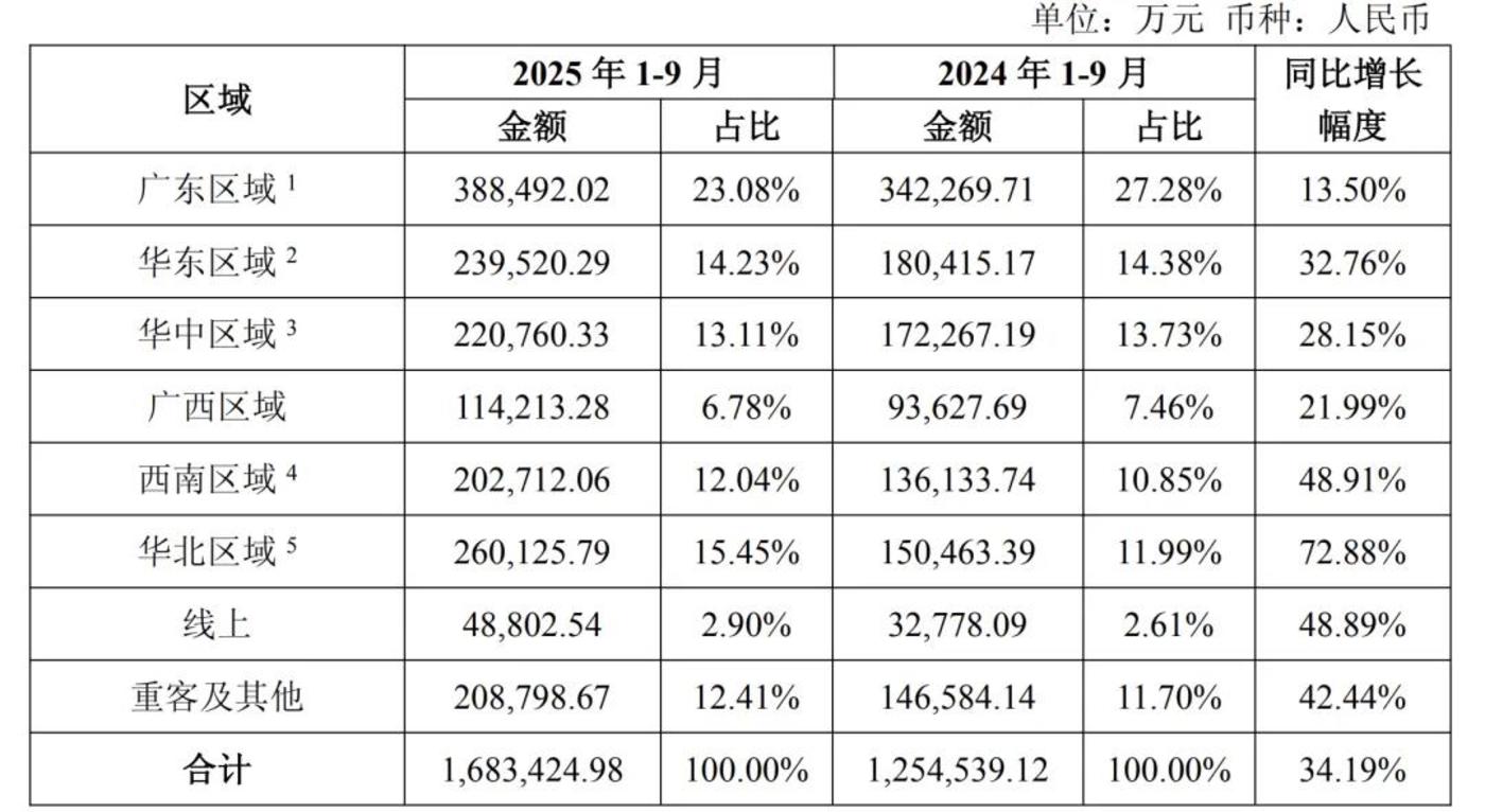 (广东区域增速放缓,华北、西南保持高增速,图:东鹏饮料 2025 前三季度经营数据公告)