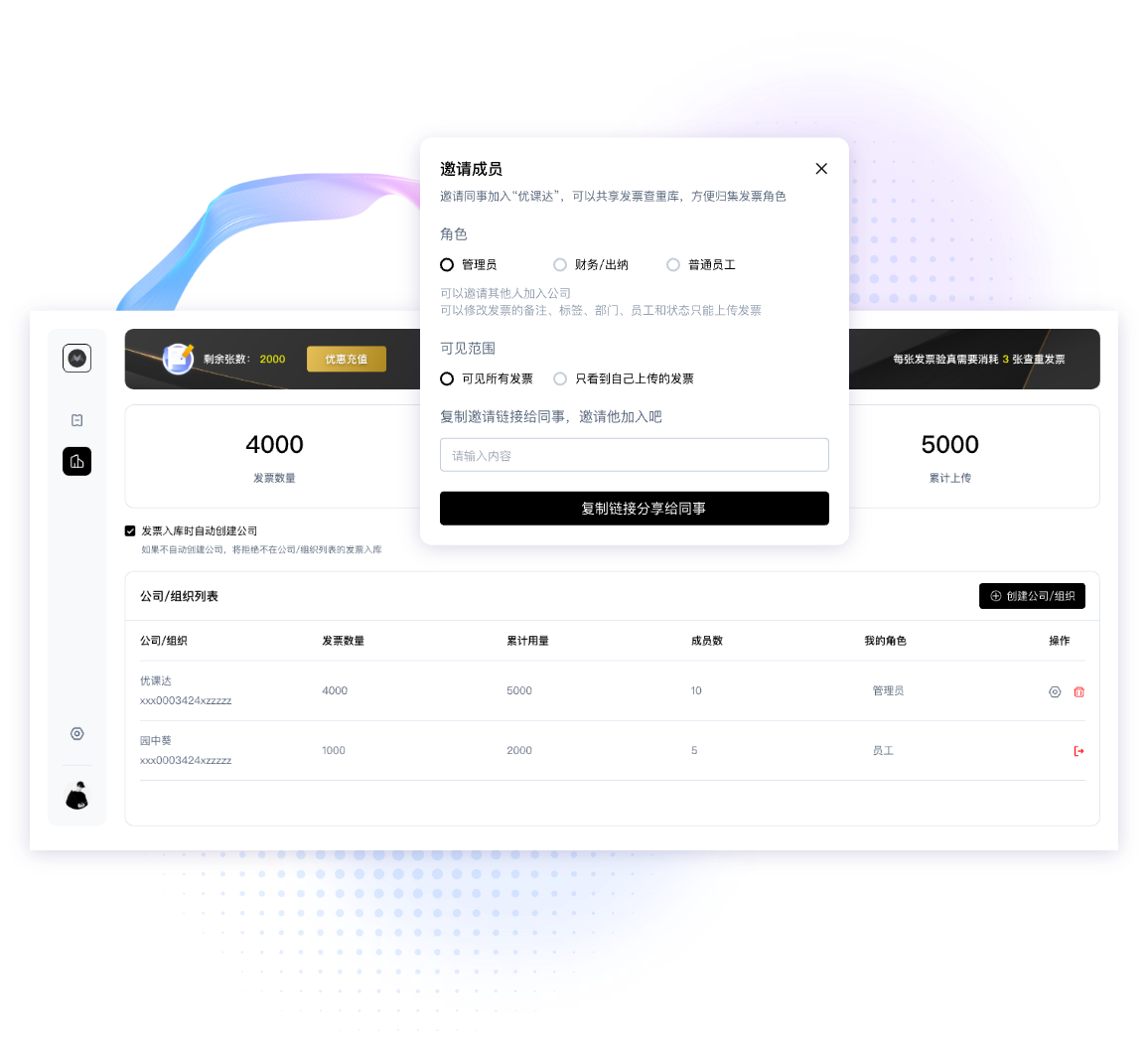 5. 管理:分部门,员工管理发票,对发票打标签