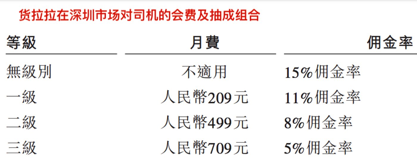 根据招股书,目前货拉拉的绝大多数司机拥有会员身份。以深圳市场为例,非会员要缴纳 15% 的订单金额作为佣金;低等级会员的佣金比例是 11%;而每月交 709 元月费的高等级会员,只要交 5% 的佣金。超级会员还有免佣待遇。