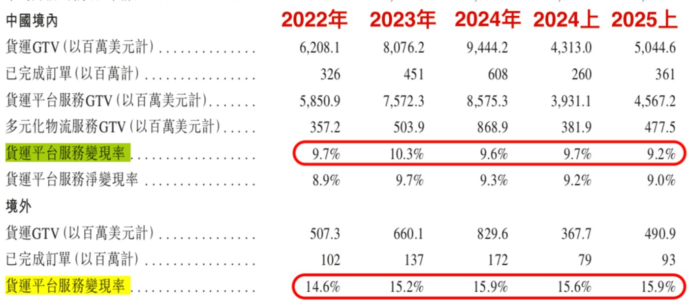 未来趋势是佣金在内地货运平台服务收入中的占比逐步走高。但另一个值得关注的数据是变现率的下降,变现率是从订单交易 GTV 中获得平台收入的 take rate 比例,货拉拉的货运平台变现率在 2022 年、2023 年、2024 年及 2025 上半年分别为 9.7%、10.3%、9.6% 和 9.2%,这与 2024 年公司调整变现策略导致收入增速低于 GTV 增速直接相关。