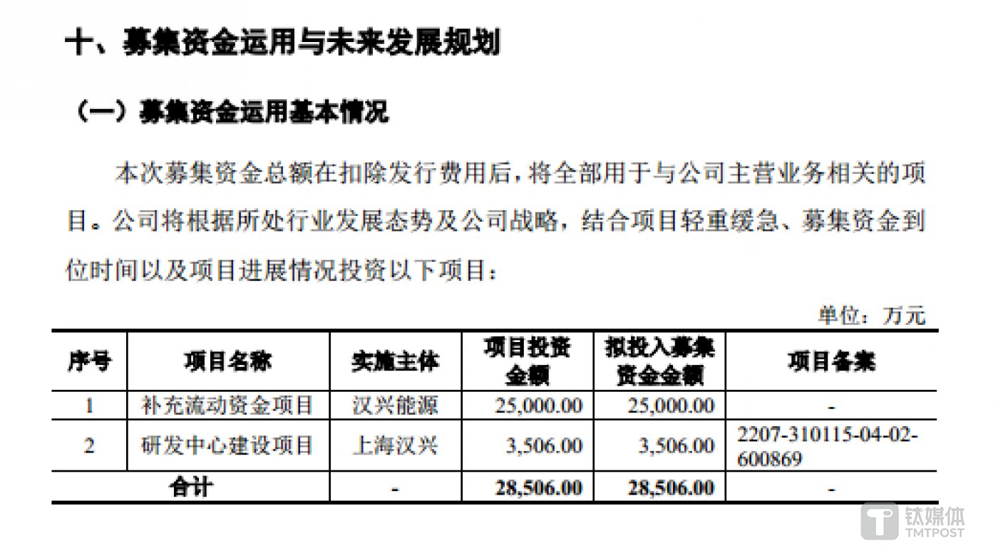 抛开行业是否产能过剩问题,如果仅看汉兴能源此次 IPO 募资却也能嗅出一些不一样的味道。根据招股书披露的信息显示,公司此次上市募资和扩产毫无关系。汉兴能源此次欲募集 28506 万元分别用于补充流动资金、研发中心建设,其中 25000 万元用于补充流动资金,占募资总额的 87.7%,换言之,汉兴能源此次 IPO 上市的主要目的是为了补流。