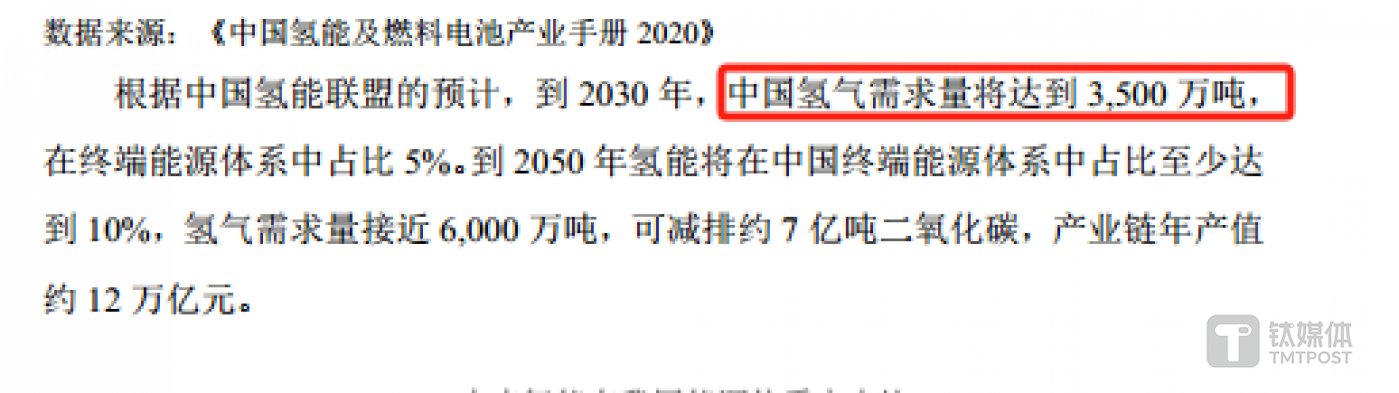 根据中国氢能联盟的预计,到 2030 年,中国氢气需求量将达到 3500 万吨,在终端能源体系中占比 5%。
