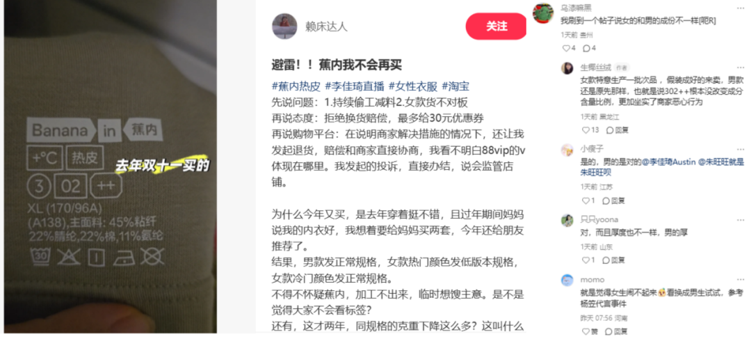 更为关键的是,引发争议的产品并非强调款式、时尚的外搭单品,而是款式高度相似、功能诉求极为单一的基础保暖内衣。在这一品类中出现明显的品质差异,迅速触动了消费者对于公平的敏感神经。