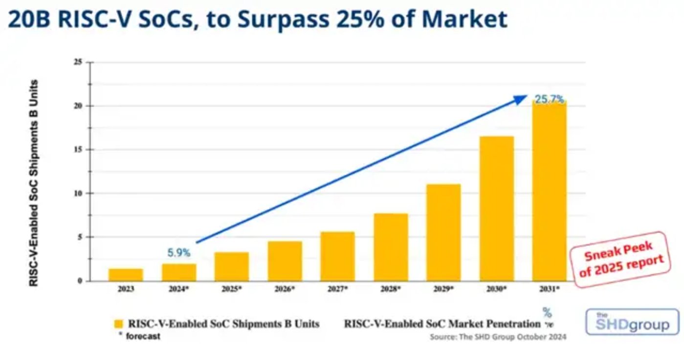 The SHD Group 预测,到 2030 年,全球 RISC-V SoC 出货量将达 162 亿颗,市场规模 927 亿美元,年复合增长率高达 47.4%,远超传统架构。其中,AI 加速器将成为增长最快领域,预计贡献超 400 亿美元营收。