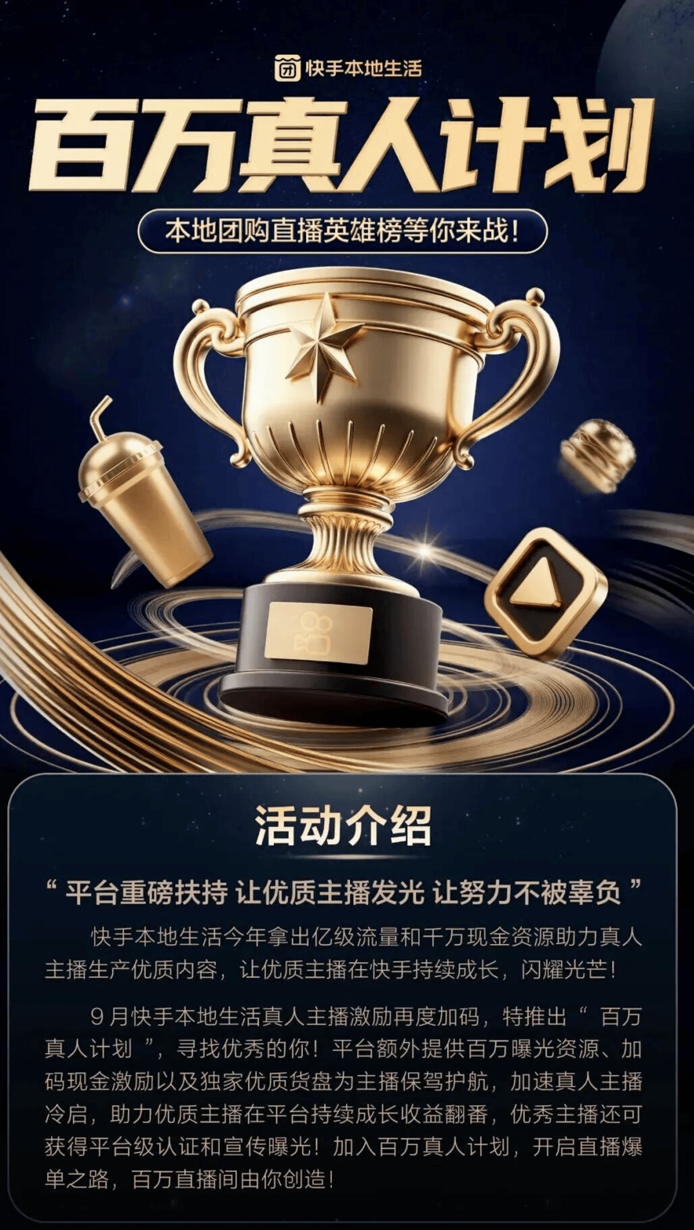 今年 9 月,快手还启动本地生活 「百万真人计划」,面向真人主播达人推出新一轮流量与现金扶持政策,通过流量现金资源等多重平台支持,帮助优质主播突破冷启动瓶颈、实现稳定成长。