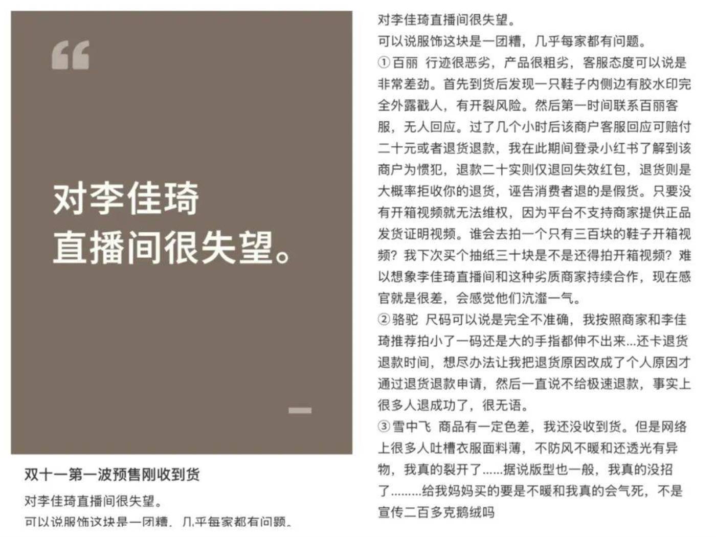 小红书上,用户舟子君发帖称,今年双十一在李佳琦直播间购买了百丽、骆驼和雪中飞的衣服,收货后发现商品各有各问题,退款体验也很差。