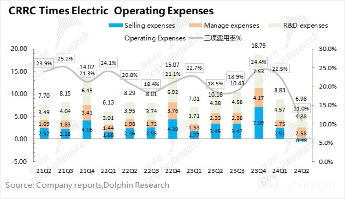 时代电气在 2024 年二季度的经营费用 6.98 亿元,同比下滑 31.3%。主要是受会计政策调整的影响,销售费用数据大幅下降。公司上半年经营费用率 15.4%,明显下降。
