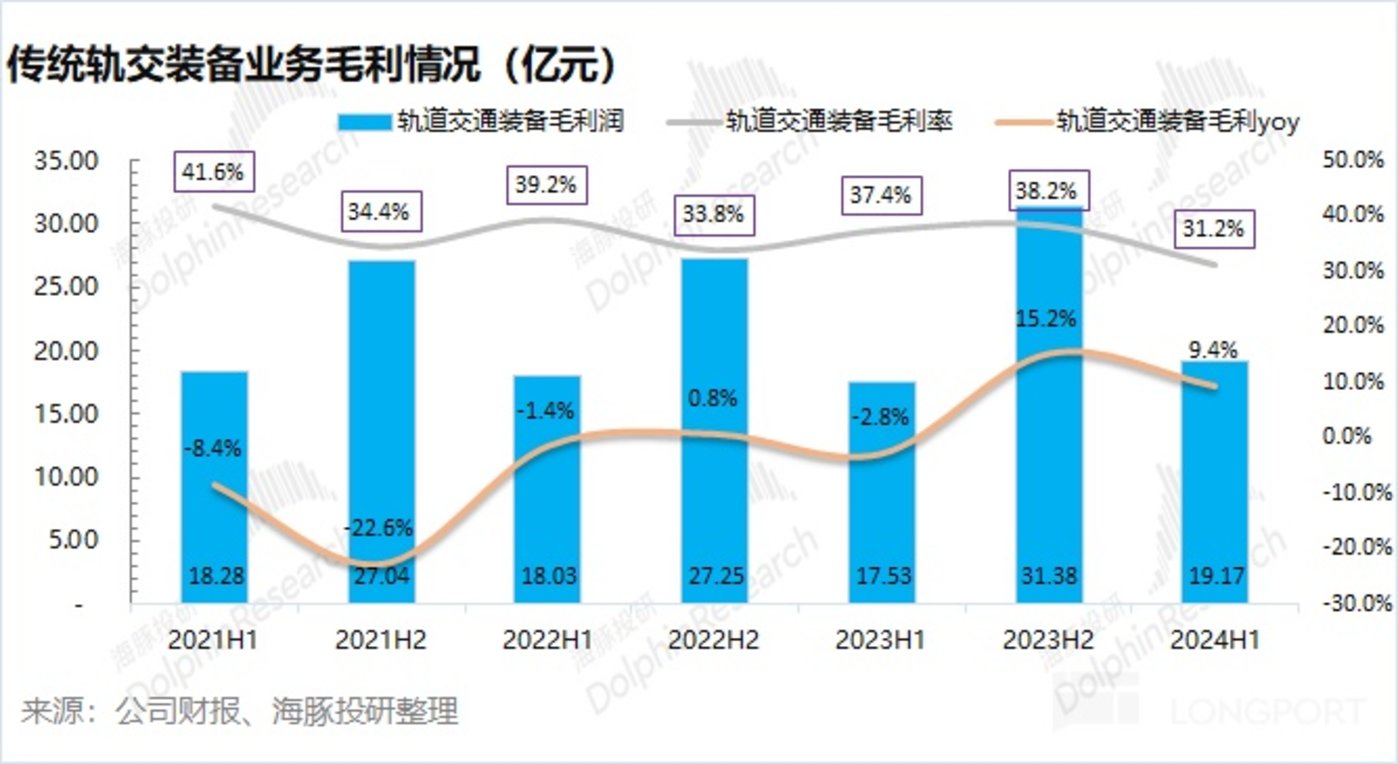 2024 年上半年公司传统轨交设备业务实现毛利 19.17 亿元,同比增长 9.4%。此外,上半年传统轨交业务的毛利率下降至 31.2%。海豚君认为这里毛利率大幅下降的原因,也主要是受 「保证类质保费用」 影响。在相同口径下,公司上半年整体毛利率还是提升的。因而,轨交设备毛利率实际上并没有出现如此大的降低。