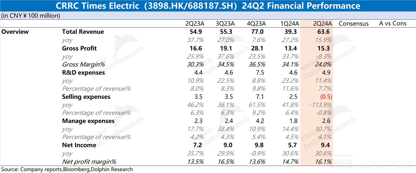 1、整体业绩:中车时代电气 2024 年二季度实现收入 63.6 亿元,同比增长 15.9%,公司收入增长主要来自于轨交业务的拉动。公司 2024 年二季度季度实现归母净利 9.4 亿元,同比增长 30.6%。利润增长,来自于收入端增长和费用端的降低。