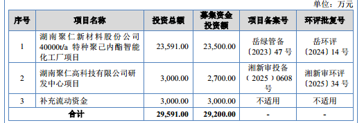 聚仁新材此次北交所 IPO 欲募集 2.92 亿元分别用于湖南聚仁新材料股份公司 40000t/a 特种聚己内酯智能化工厂项目、湖南聚仁高科技有限公司研发中心项目、补充流动资金,具体情况如下: