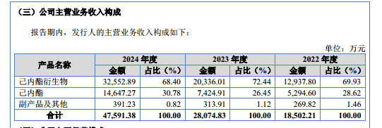 不过,这一业绩增长或与公司采取的降价模式密切相关。从业务结构来看,聚仁新材主要拥有己内酯衍生物、己内酯、副产品及其他等,其中报告期内己内酯衍生物产生的销售收入分别为 12937.8 万元、20336.01 万元、32552.89 万元,分别占当期主营业务收入的 69.93%、72.44%、68.4%,为公司最重要的业务,具体情况如下: