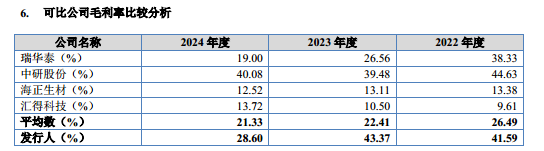 不过,即便 2024 年毛利率大幅收缩,聚仁新材的毛利率水平仍保持着行业优势。据公司申报稿披露,其选取的同行可比公司分别为瑞华泰、中研股份、海正生材、汇得科技,上述 4 家公司毛利率的平均值分别为 26.49%、43.37%、28.6%,从数据对比来看,聚仁新材各期毛利率均显著高于同行均值,即便在 2024 年毛利率大幅下滑后,仍比同行均值高出 7.27 个百分点。