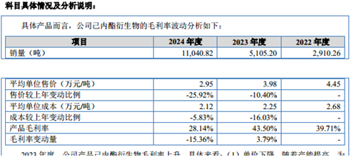 受产品售价持续下降的影响,聚仁新材报告期内的毛利率呈现明显波动,且在 2024 年出现大幅下滑。具体来看,报告期内,聚仁新材的毛利率分别为 41.59%、43.37%、28.6%,其中 2024 年公司的毛利率同比下滑了近 14.77 个百分点。