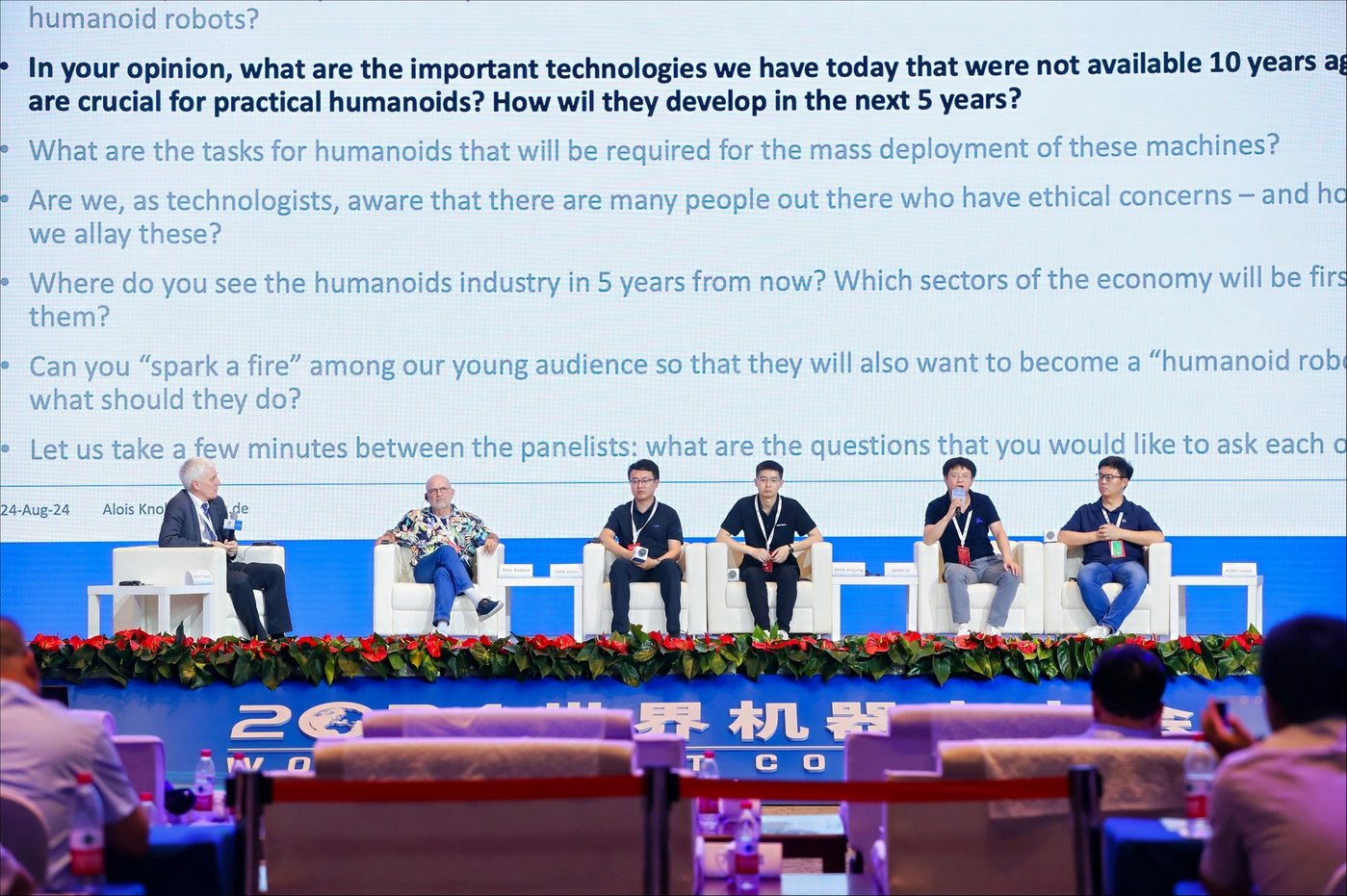 此次圆桌由德国慕尼黑工业大学教授 Alois.C.Knoll 主持,美国波士顿动力创始人 Marc Raibert(马克·雷伯特),与中国四大 AI 机器人企业领军者——陈建宇、王兴兴、王鹤、熊友军,五人围绕机器人行业、AI 大模型驱动机器人发展等议题展开讨论。