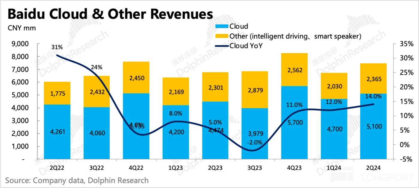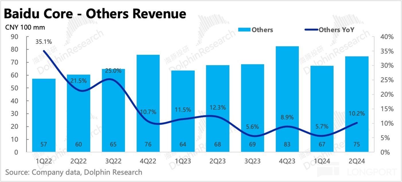 二季度其他业务收入 75 亿,同比增长 10%,主要还是智慧云在低基数 +AI 的带动下,增速进一步提升至 14%。智慧云之外其他业务也恢复正增长,其中萝卜快跑是亮点。