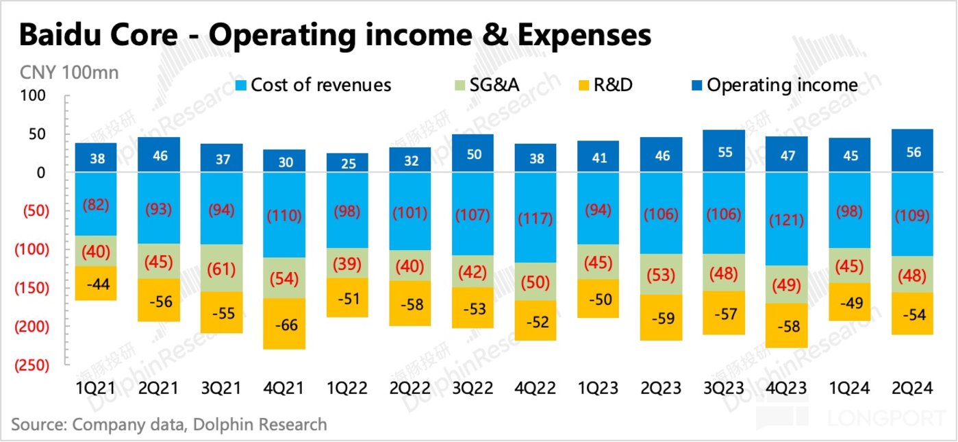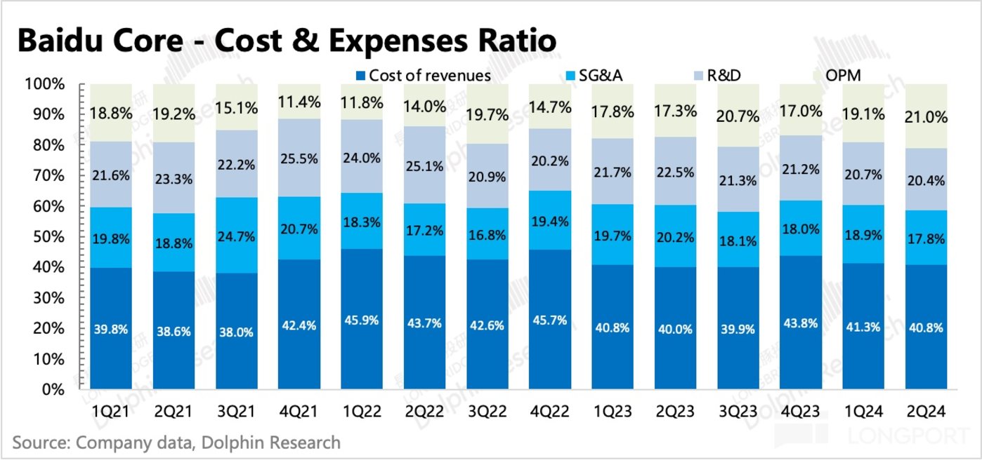 和一季度一样,二季度 SBC 费用继续同比大幅下滑 28%,说明优化主要来自于裁员/减薪,此外就是推广费用估计也降低了一些。最终二季度百度核心的经营利润 56 亿,利润率 21%,同比改善 4pct,环比也提升了 2pct,超出市场预期。