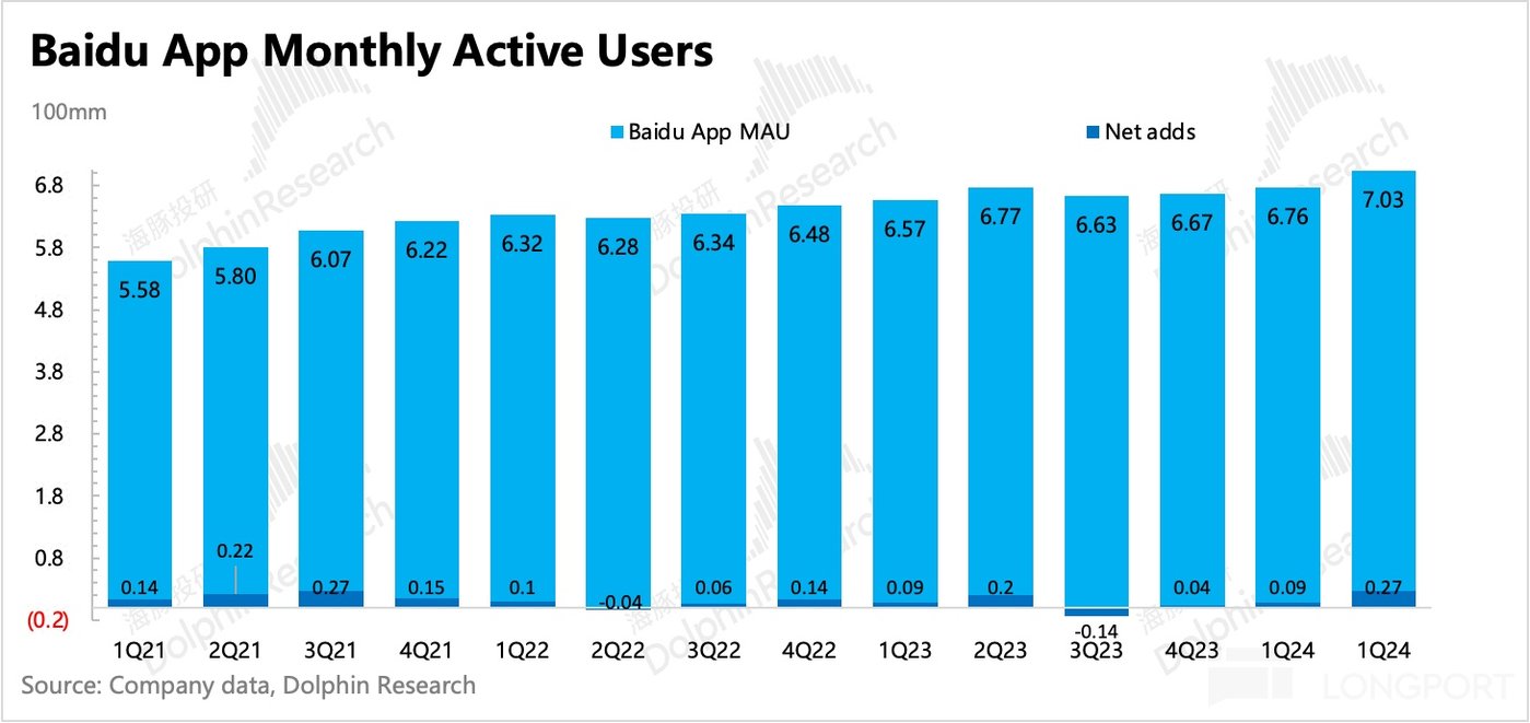 核心原因还是百度的搜索生态本身不具备优势,仅规模较高,但用户粘性和时长都是偏弱的。不过二季度手机百度 APP 的月度用户数有所回升,净增加 2700 万。海豚君猜测,可能是因为 AI 搜索体验的渗透提升,吸引到了一些用户回流。