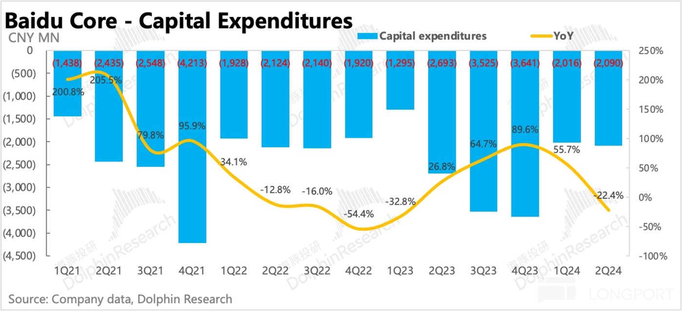 从资本开支上看百度对 AI 服务器、芯片的投入,二季度资本开支环比有所回落,同比更是下滑 22.4%,似乎意味着近一年高歌猛进的投入暂缓。当然具体变动可能还要看行业发展变化,不过就目前而言,若下游应用端没有出现更多的王炸产品,短期在收入承压下,百度持续增加资本开支的动力应该也不会太高。