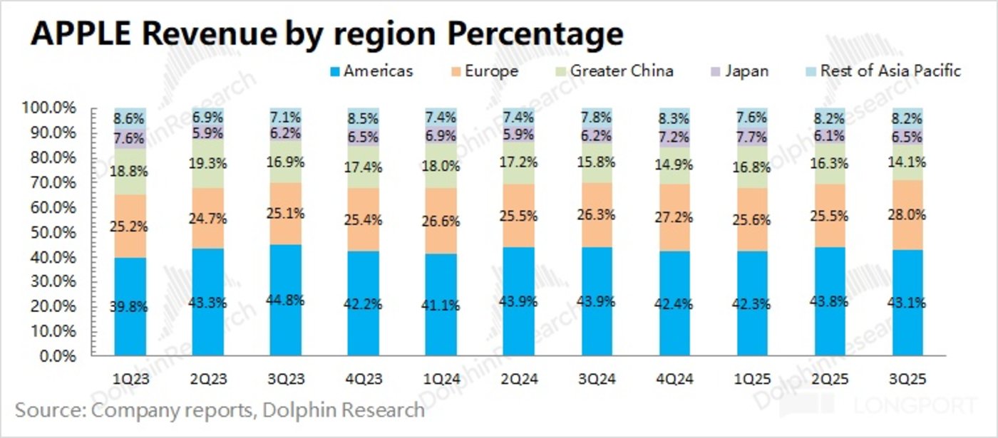 5、分地区收入:其中美洲地区依然是公司基本盘,收入占比维持在 43%,本季度实现 6.1% 的同比增长;大中华区是本季度收入唯一同比下滑的地区,主要是受国补政策以及 iPhone Air 发布推迟的影响。