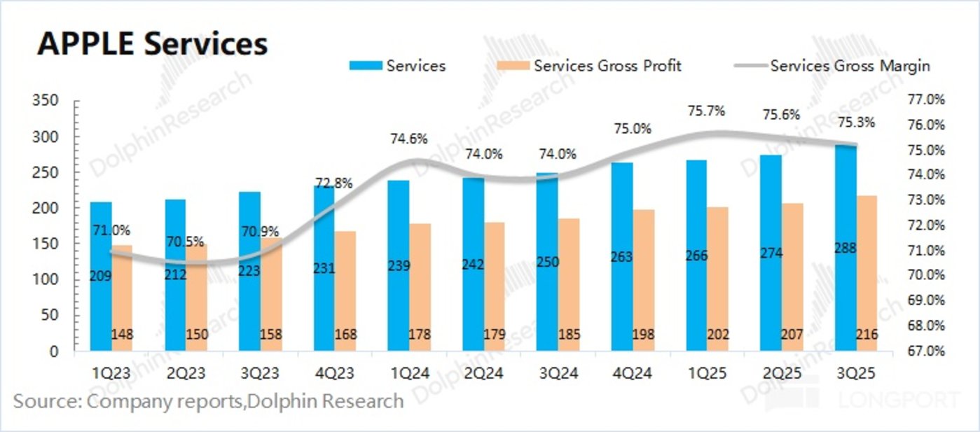 4、软件服务:公司软件服务本季度收入依然有 288 亿美元,好于市场一致预期 (282 亿美元)。凭借 75.3% 的高毛利率,公司软件业务以 28% 的收入占比,产生了公司 45% 的毛利润。