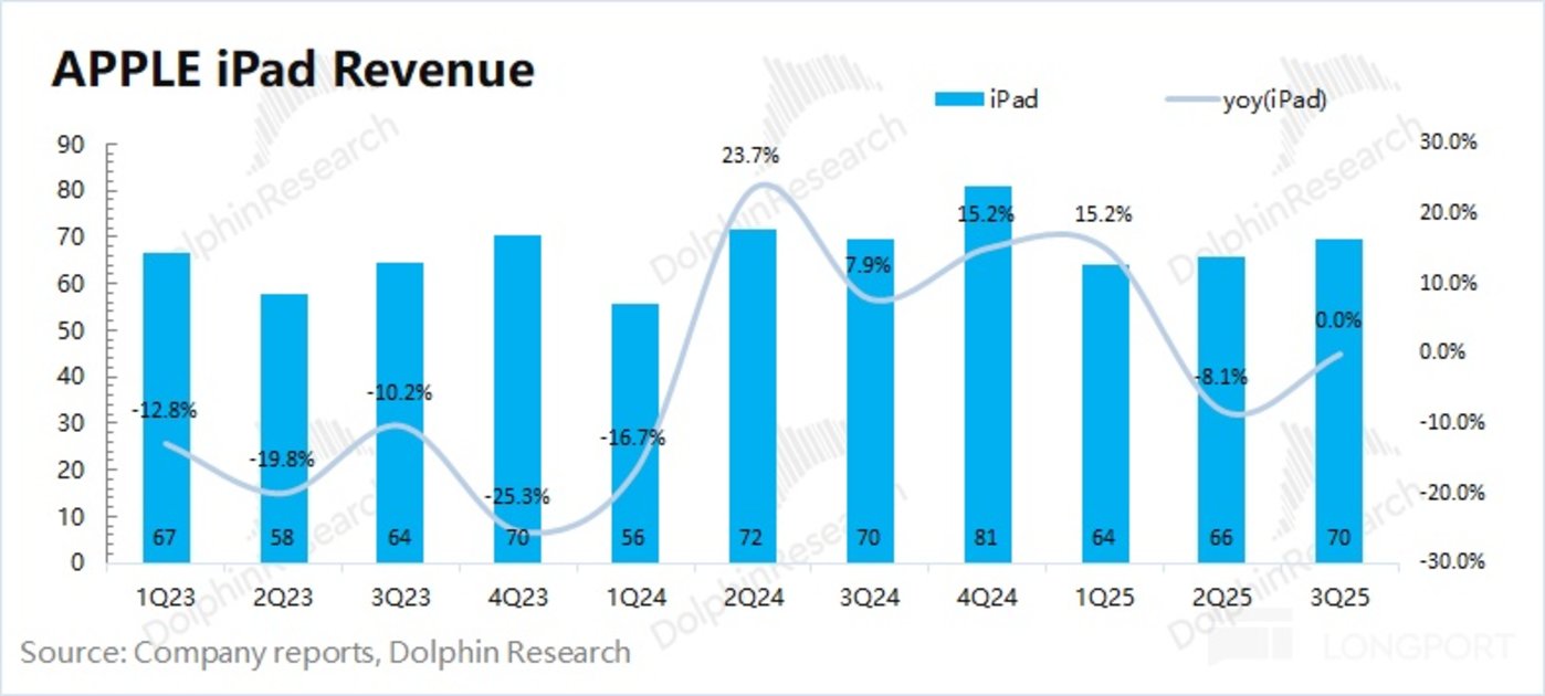 2025 财年第四季度 (即 3Q25)iPad 业务收入 70 亿美元,同比持平,市场一致预期 (70 亿美元),由于去年 iPad Air/Pro 的发布导致基数较高。