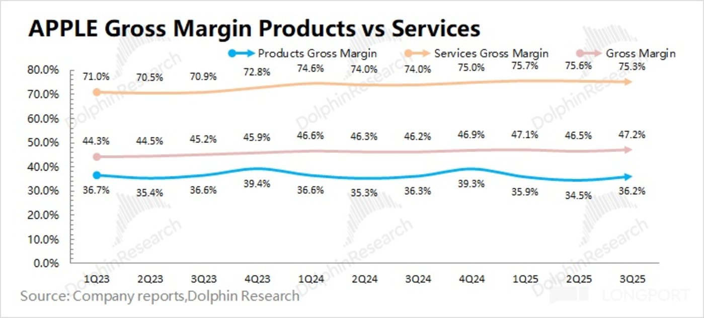 苹果公司本季度软件毛利率维持在 75.3% 的相对高位,是本季度公司毛利率提升的主要来源。而硬件端的毛利率维持在 36.2%,其中本季度关税相关成本影响大约在 11 亿美元。若剔除该影响,公司本季度硬件端毛利率约为 37.7%,实际上应该是同比提升 1.4pct。