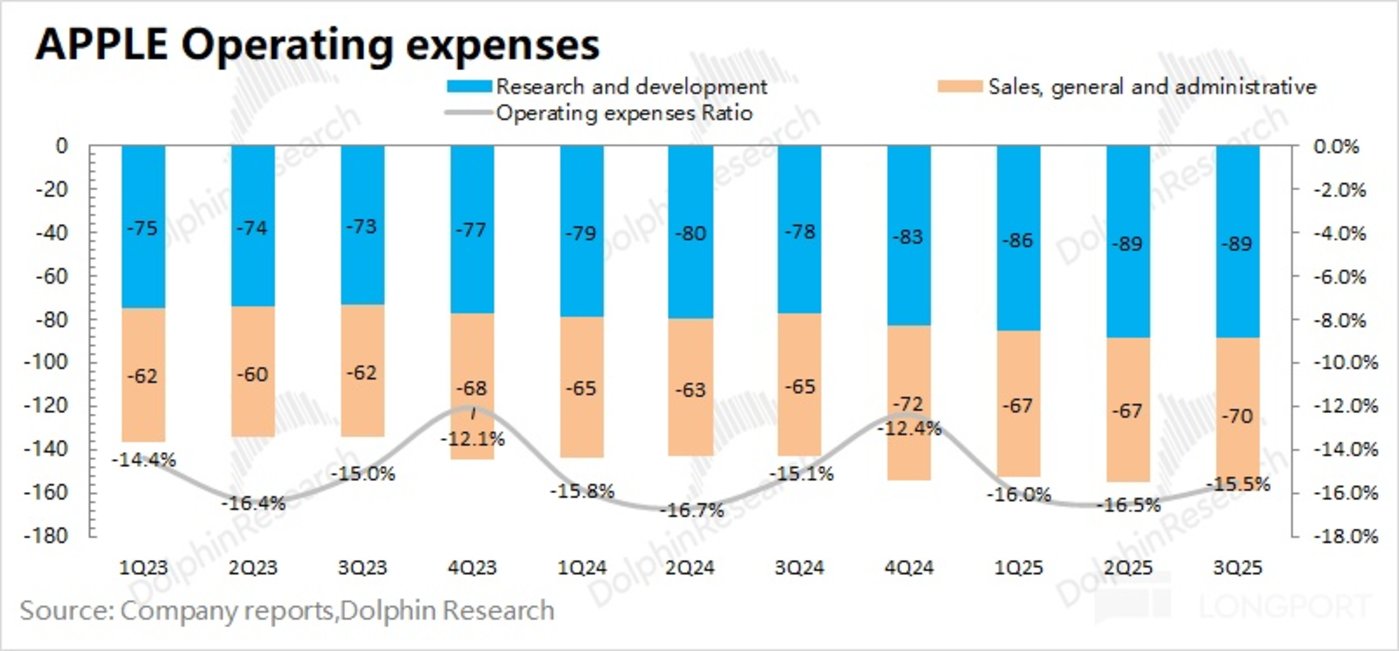 本季度苹果公司的经营费用率为 15.5%,同比下降 0.4pct。公司销售和行政费用保持稳定,这个季度多增的支出也主要体现在研发支出中。