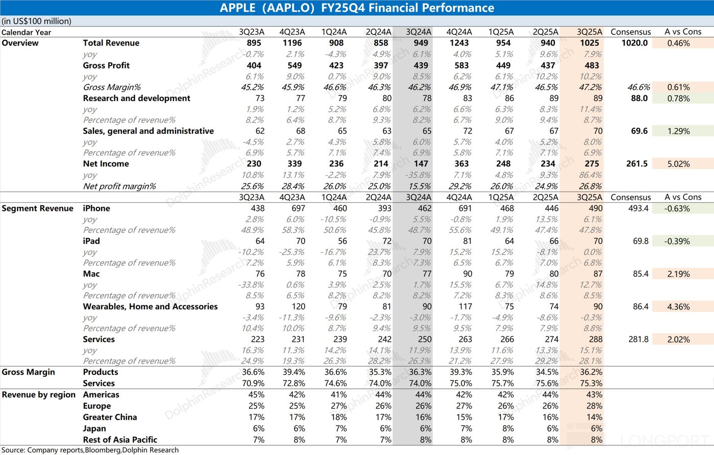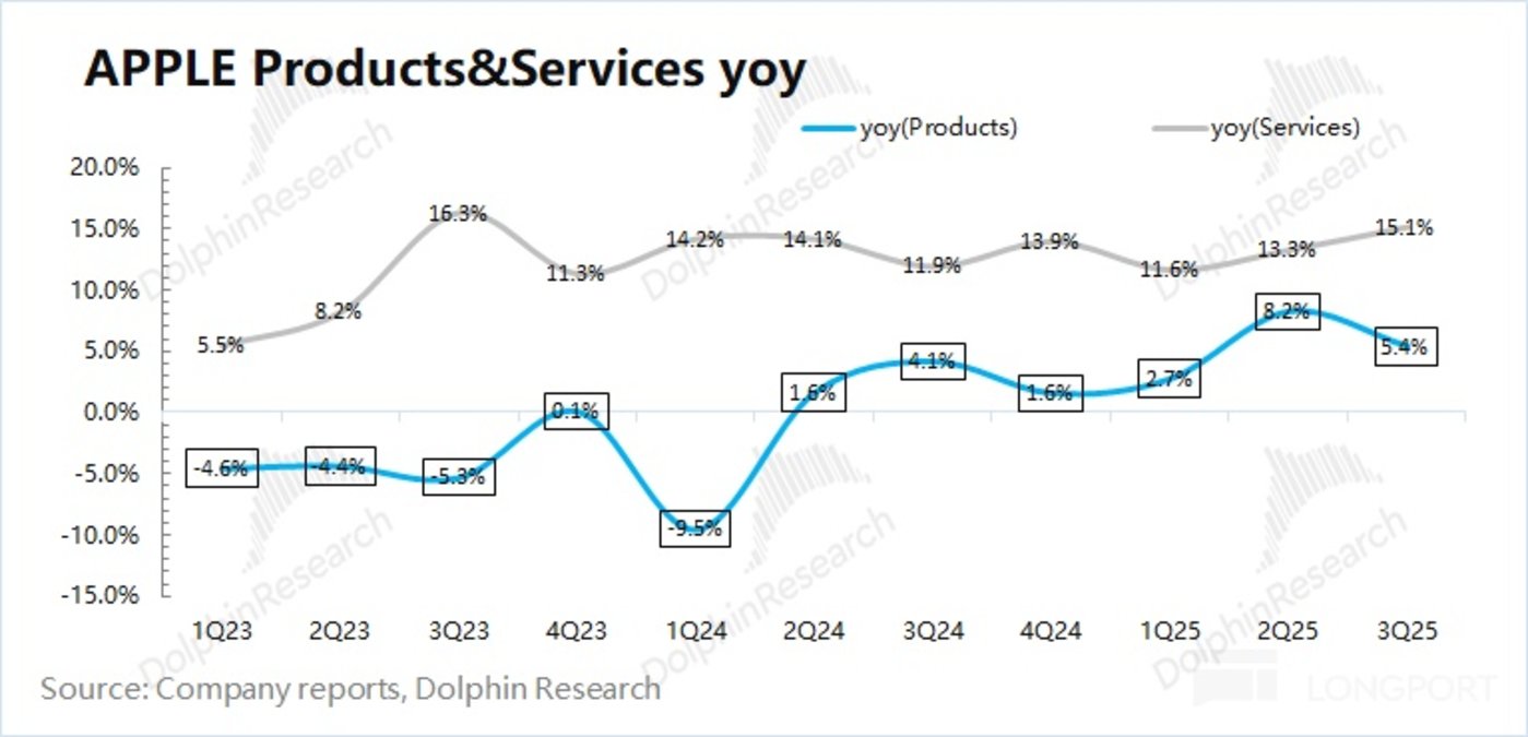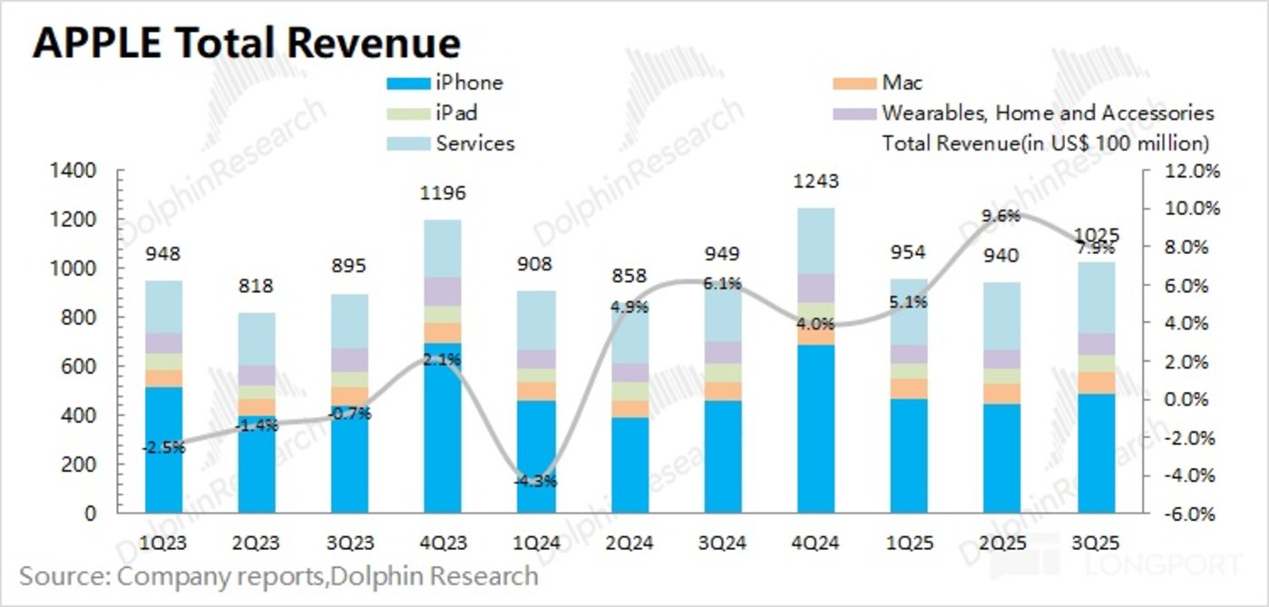 1.1 收入端:2025 财年第四季度 (即 3Q25) 苹果公司实现营收 1025 亿美元,同比增长 7.9%,符合市场一致预期 (1020 亿美元)。公司本季度收入端的提升,主要受益于 iPhone、Mac 和软件服务业务增长的带动,而 iPad 和可穿戴等其他硬件业务表现仍相对较弱。