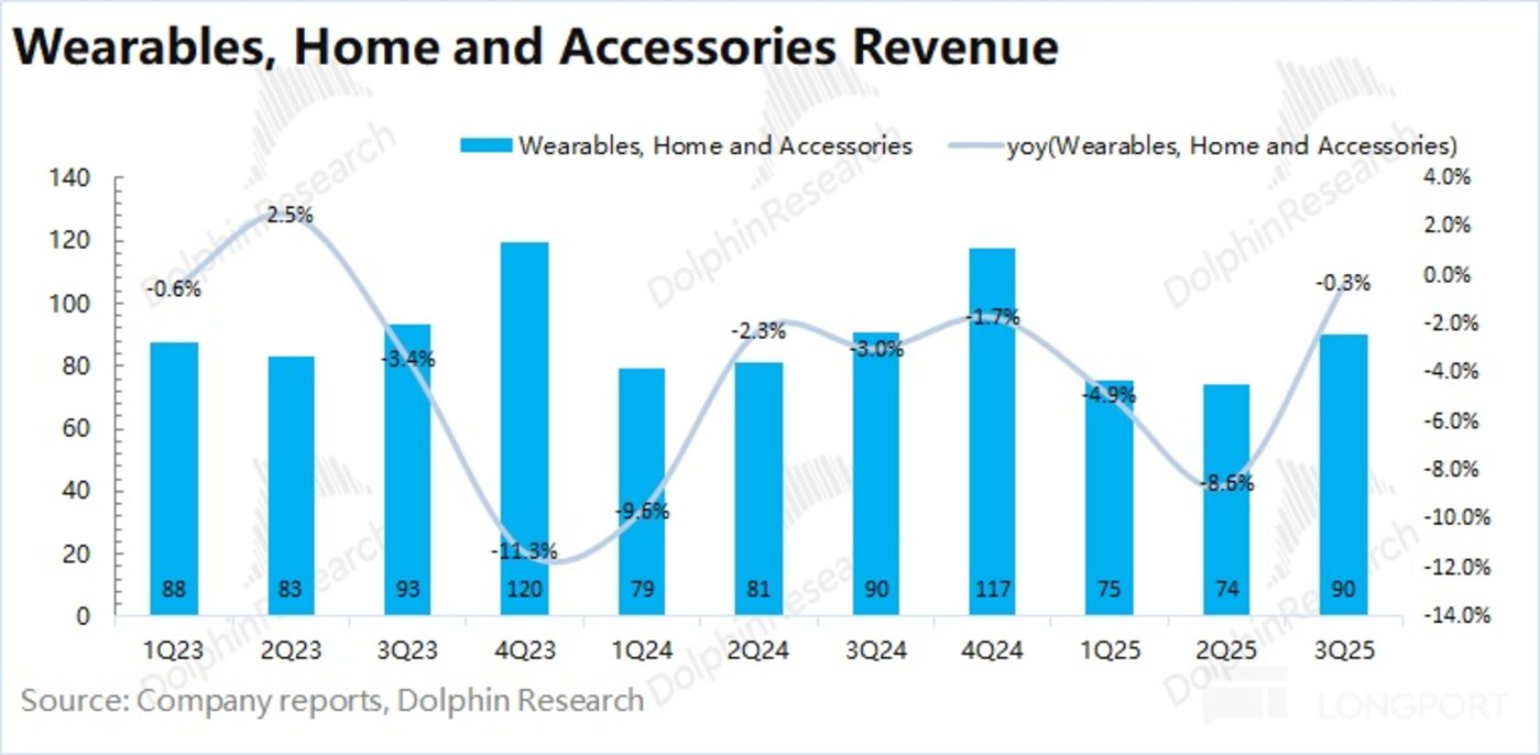 2025 财年第四季度 (即 3Q25) 可穿戴等其他硬件业务收入 90 亿美元,同比下滑 0.3%,好于市场预期 (86.4 亿美元)。可穿戴及其他业务,在本季度基本止住了连续九个季度以来的下滑。
