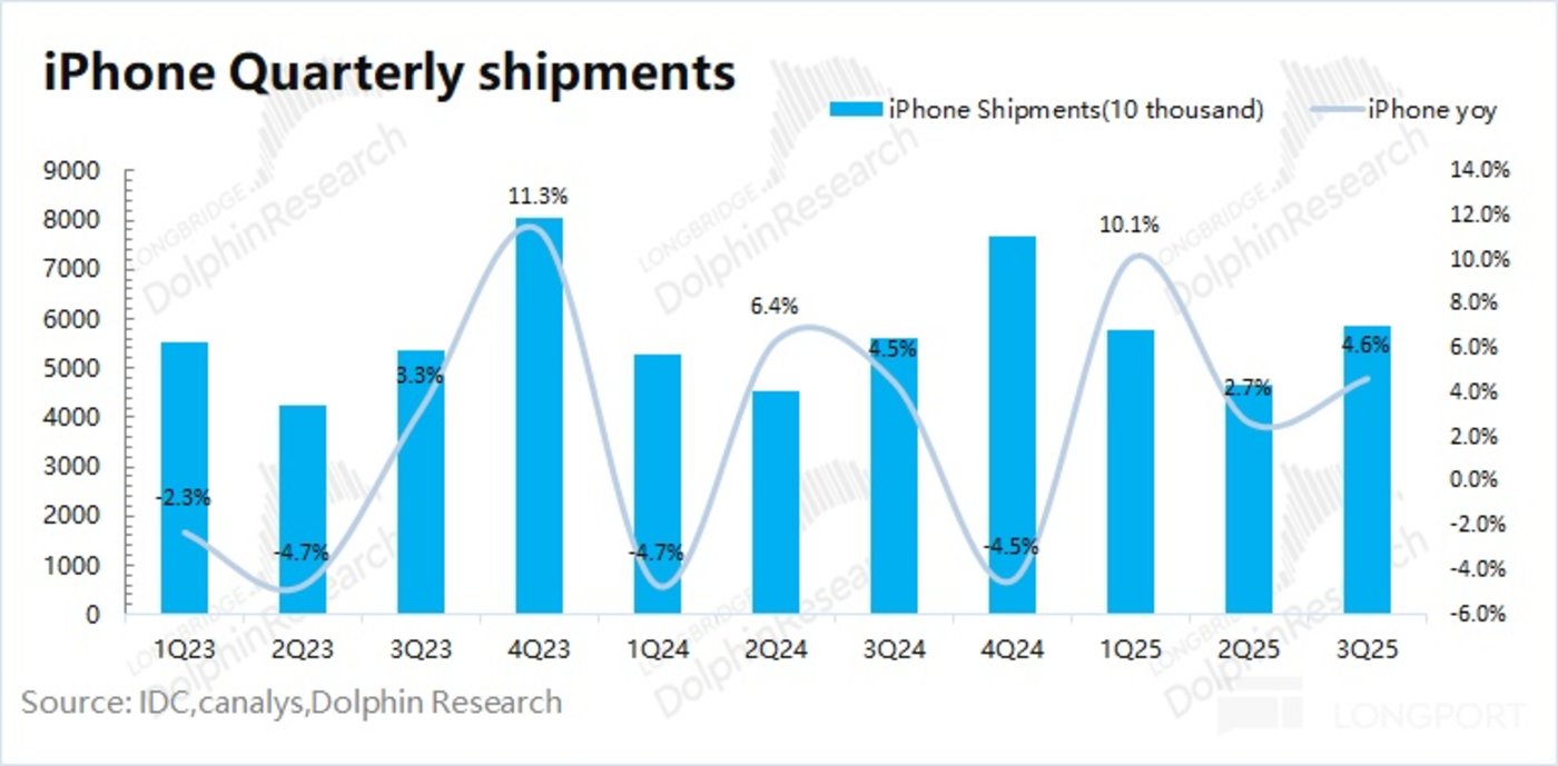 公司本季度出货量增长,主要来自于 iPhone17 系列新品和新兴市场的带动。此外中国地区 iPhone Air 的延迟发布,对本季度出货量也有所影响,实际需求面应该好于 4.6% 的表现。