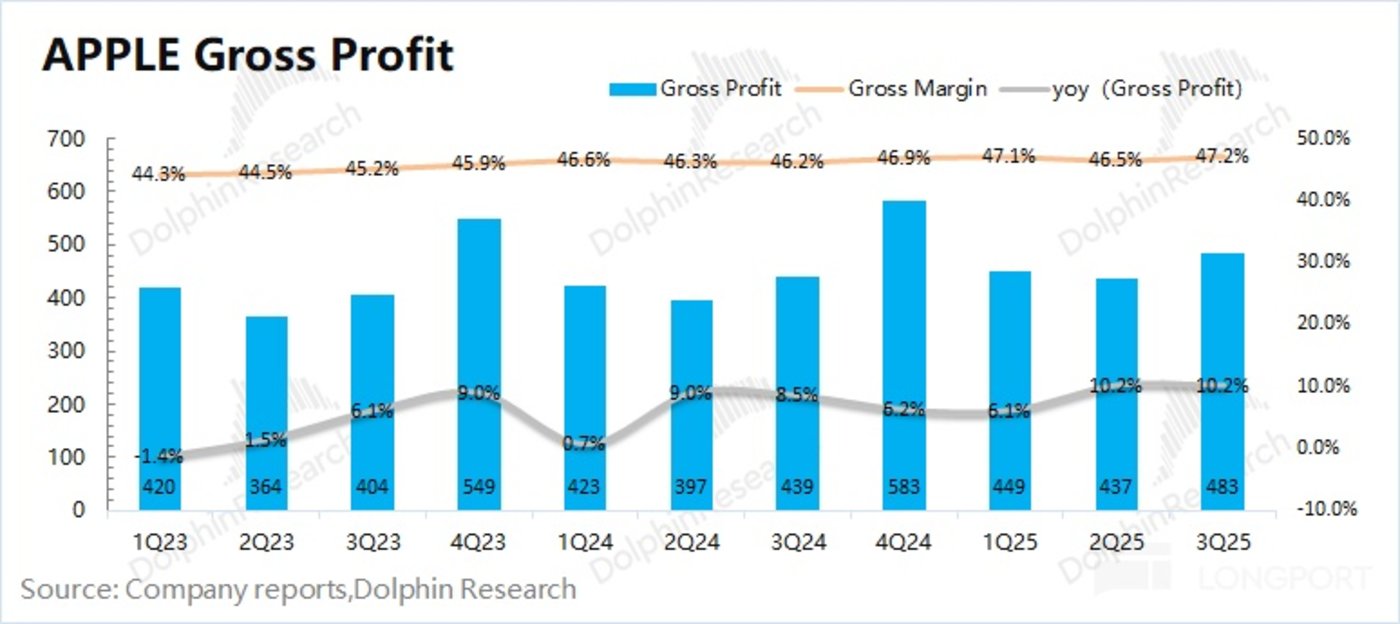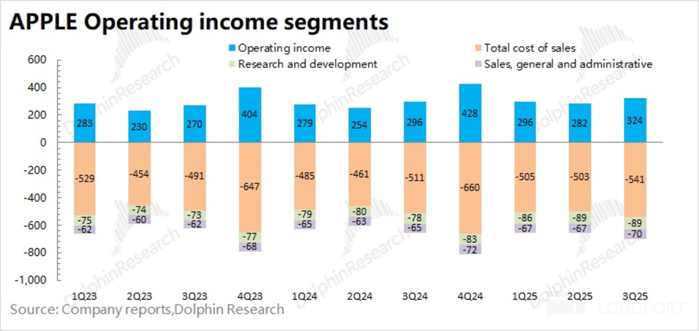 1.3 经营利润:2025 财年第四季度 (即 3Q25) 苹果公司经营利润 324 亿美元,同比增长 9.6%。苹果公司本季度经营利润的增长,是受收入增长和毛利率提升的共同带动。