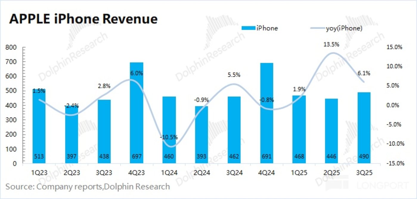 2025 财年第四季度 (即 3Q25)iPhone 业务收入 490 亿美元,同比增长 6.1%,略低于市场预期 (493 亿美元)。公司 iPhone 业务本季度的增长,主要得益于 iPhone17 系列新品以及新兴市场需求增长的带动。