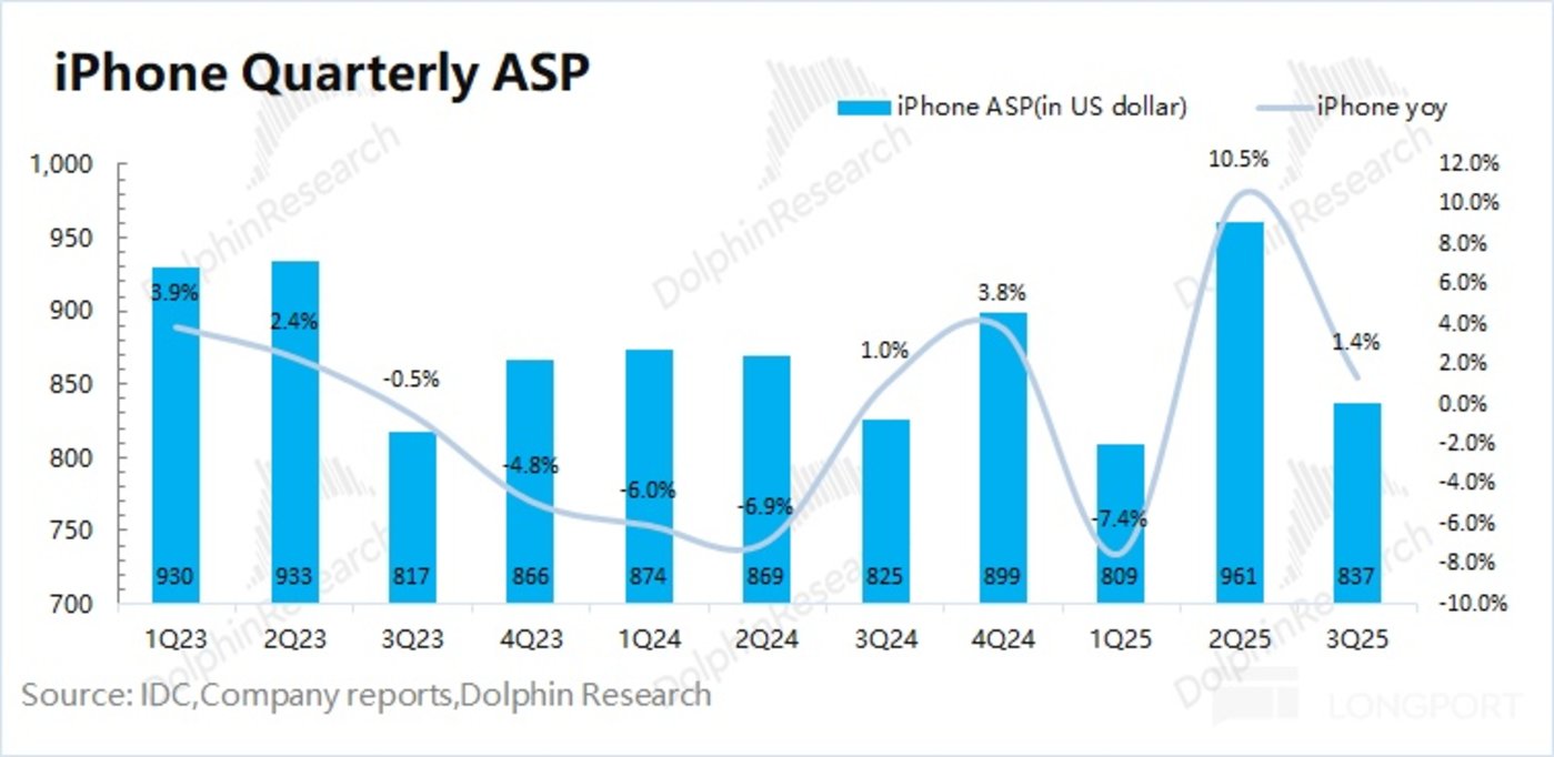2、iPhone:本季度$苹果 (AAPL.US) iPhone 业务实现营收 490 亿美元,同比增长 6.1%,略低于市场预期 (493 亿美元)。本季度手机业务的增长,受 iPhone17 系列新品发布的推动。对于本季度,海豚君估算 iPhone 整体出货量同比增长 4.6%,出货均价同比上涨 1.4%。