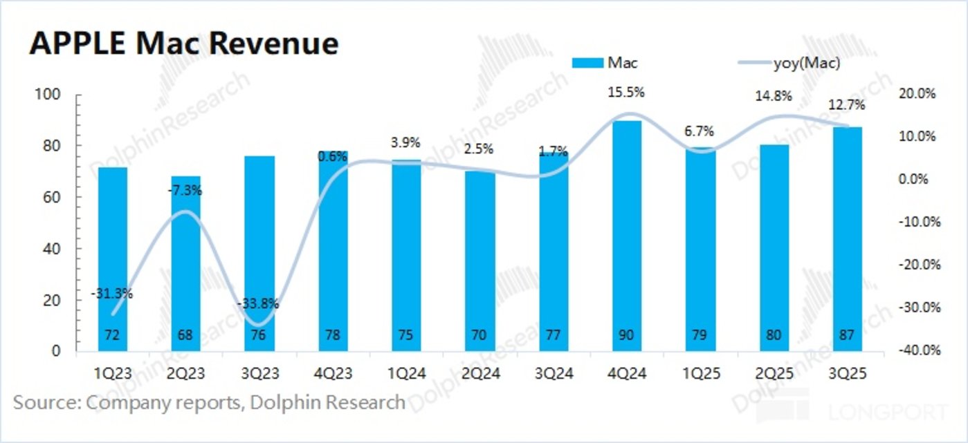 2025 财年第四季度 (即 3Q25)Mac 业务收入 87 亿美元,同比增长 12.7%,略好于市场预期 (85 亿美元)。