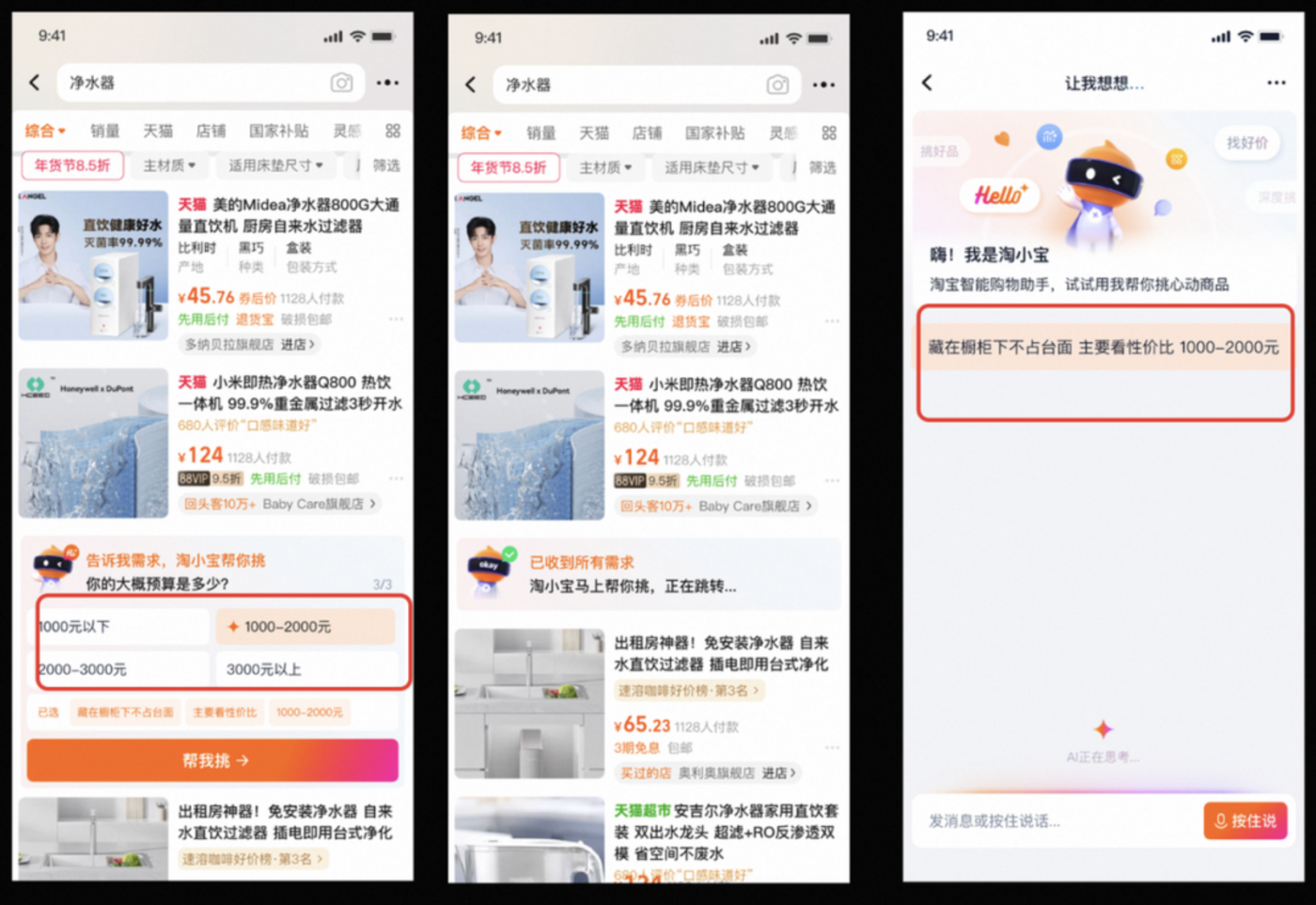 作为原有电商产品 AI 优化的代表,淘宝的 AI 万能搜和 AI 助手虽然已经全量上线,但更像是平台给到用户的一种尝鲜体验,难以在短时间形成强大的爆发力。阿里巴巴中国电商事业群搜推智能总裁凯夫认为,这类创新产品要贴着用户反馈做,多去测一测、看一看,还需要时间去教育用户。