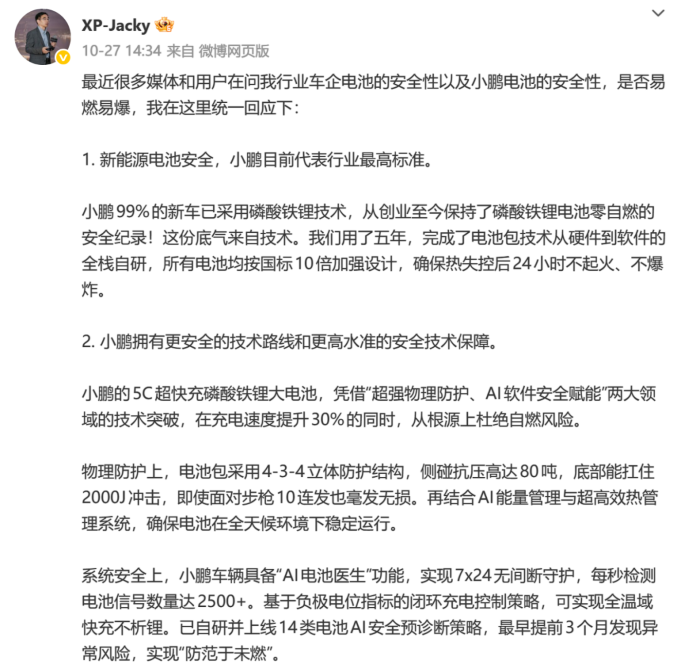 所以在这次 MEGA 起火之后,很多企业也公开回应了做电池方案的思路以及安全问题。比如小鹏动力总成高级总监顾捷就在微博表态,小鹏 99% 的新车都用磷酸铁锂电池,加上额外的安全补充措施,创业至今 「零自燃」。