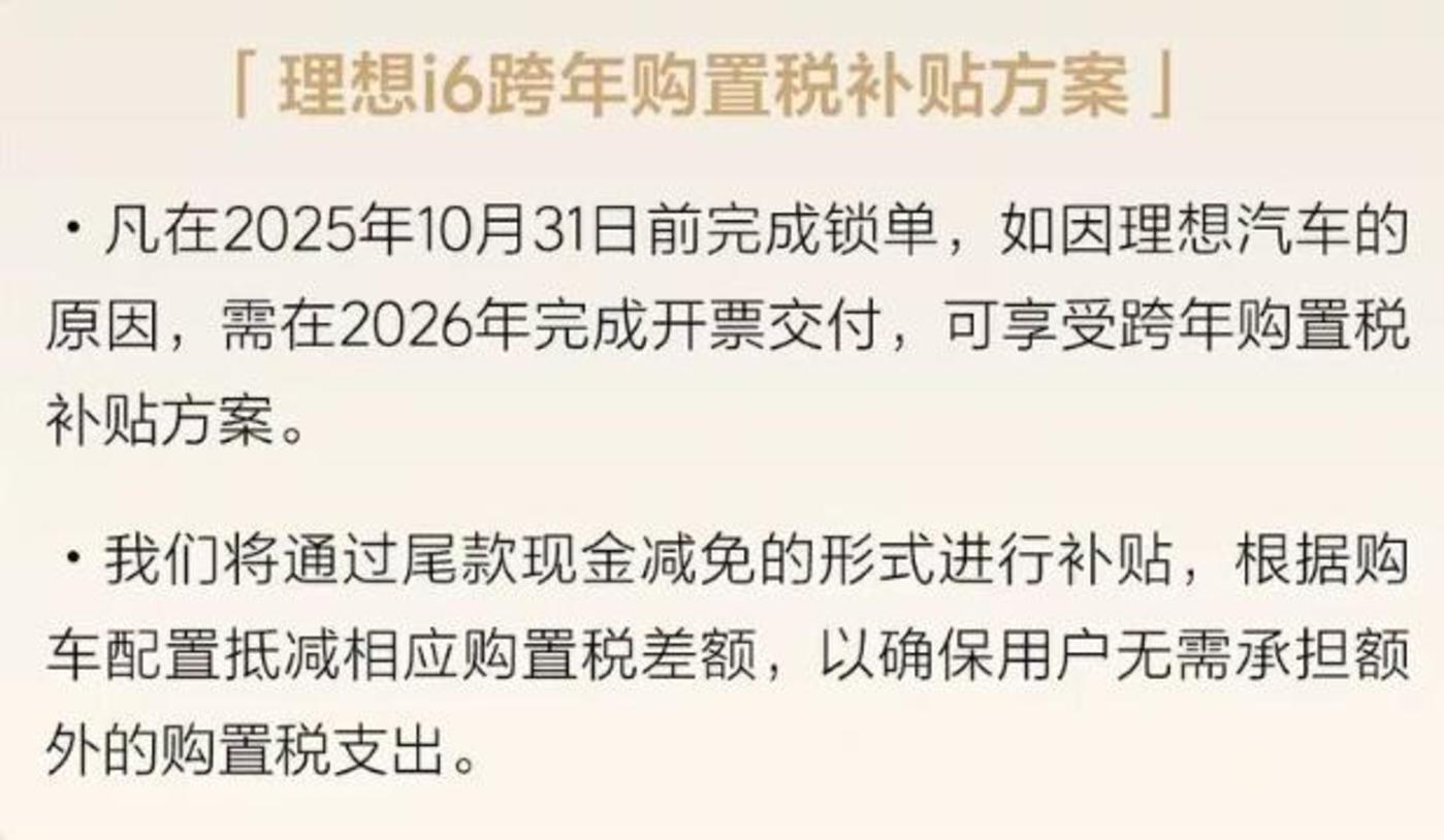 而理想对 i6 的购置税补贴政策为,针对 2025 年 10 月 31 日前锁单的理想 i6,可通过尾款现金减免形式,根据购车配置抵减相应购置税差额。一名理想汽车销售人员在接受央广网采访时表示,理想 i6 在 10 月 31 日之前订车,明年 2 月份左右能够提车,可以做到购置税兜底。