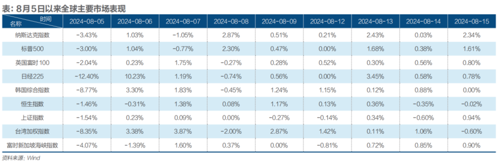 不过,在各国市场监管层积极表态、套利交易仓位降低、美国方面积极数据信号发布之后,市场的恐慌情绪日前已逐步修复。截至 8 月 21 日,日经 225、韩国综合指数等市场指数经历巨震后已反弹至接近 8 月初的水平。